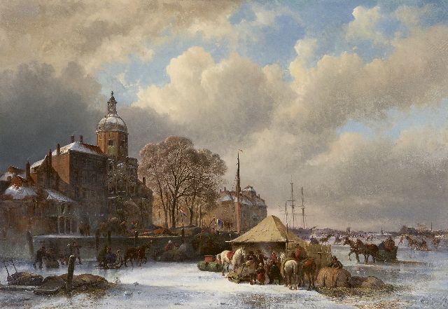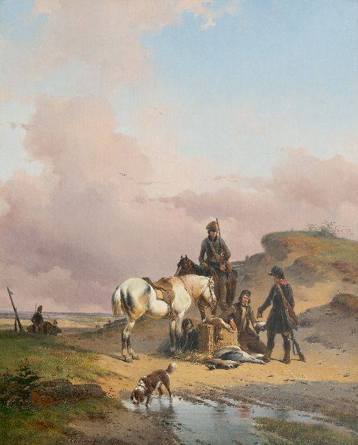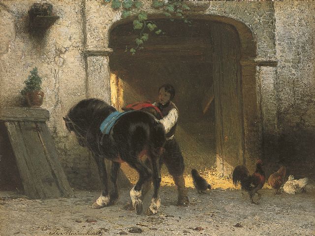 J.J. Moerenhout war ein belgischer Maler von Strandszenen und Landschaften, oft mit Pferden gepolstert. Er wurde in Antwerpen von H. van der Poorten und in Paris von Horace Vernet, dem damals bekannten Maler der Geschichte und der Militärszenen, ausgebildet. 1824 und zwischen 1831 und 1853 lebte er in Den Haag. In dieser Zeit polsterte er auch Arbeiten von Andreas Schelfhout und Louis Meijer.