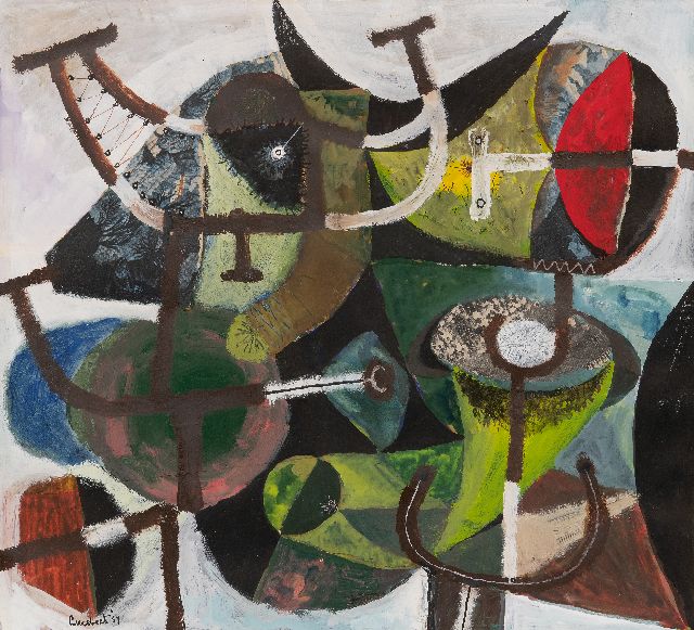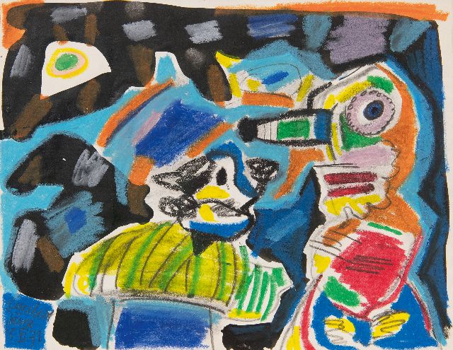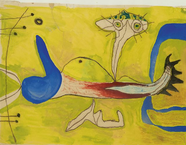 Lucebert, Pseudonym von Lubertus Jacobus Swaanswijk (1924–1994), war ein experimenteller Maler, Zeichner und Dichter und in dieser Funktion kurzzeitig Teil der CoBrA-Bewegung. Als bemerkenswertes Multitalent erfuhr er als Dichter und bildender Künstler im In- und Ausland große Anerkennung. Der breiten Öffentlichkeit war er vielleicht eher als Dichter bekannt, doch in den 60er und 70er Jahren konzentrierte er sich vor allem auf die Schaffung bildender Kunst. Seine Gemälde und Zeichnungen zeichnen sich durch große Freiheit und Spontaneität aus. Er malte, was ihm in den Sinn kam, ohne sich an feste Motive zu halten. Ab den 1950er Jahren baute er seine Zeichnungen und Gouachen aus Punkten, Linien und Kratzern auf, über die er die – absichtlich – plumpen Formen menschlicher Körper und Fantasiewesen malte. Seine stark experimentelle Natur führte dazu, dass er auch in vielen anderen Bereichen aktiv war – er fotografierte, stellte Keramik her, schrieb Theaterstücke und schuf monumentale Wandgemälde. Im Jahr 1949 fungierte Lucebert als Anführer der Bewegung der Fünfzig oder der Fünfziger, der Gruppe experimenteller Dichter, die damals für ziemliches Aufsehen sorgten. Nach dieser Zeit der Poesie widmete er sich hauptsächlich der bildenden Kunst, die ab den 1960er Jahren als figurativ-expressionistisch' bezeichnet wurde. Seine Bilder, insbesondere zu Beginn stark von CoBrA beeinflusst, zeigten eine eher pessimistische Sicht auf die Welt. Und sein formaler Ausdruck entsprach dem, was Constant bereits 1948 im CoBrA-Manifest schrieb: 'Eine Kunst, die das Problem eines vorgefertigten Schönheitsbegriffs nicht löst, sondern keinen anderen Maßstab als die Ausdruckskraft anerkennt und spontan das schafft, was die Intuition vorgibt.'