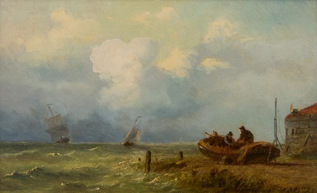 Nicolaas Martinus Wijdoogen | Fischer am Arbeit entlang einer Küste, Öl auf Holz, 17,8 x 28,3 cm, Unterzeichnet r.u.
