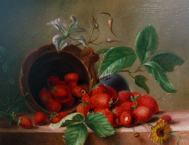 Stilleben mit Früchten und einem Eichelhäher auf einem Zweig