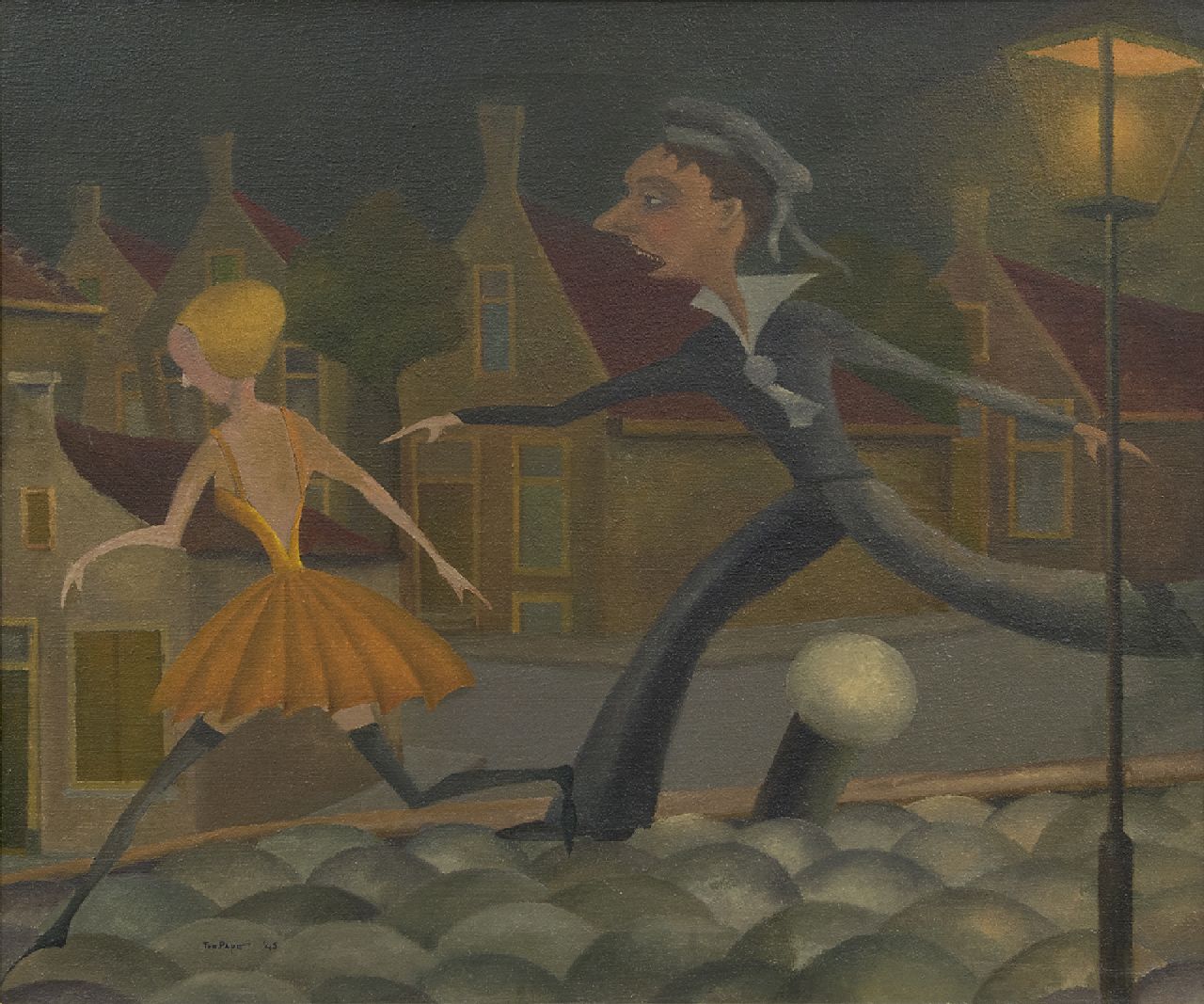 Der aus Den Haag stammende Ton Pape war ein Maler von außergewöhnlicher Originalität, der zwischen figurativen und abstrakten Arbeiten wechselte. Seine bevorzugten Motive waren die Dünen mit ihren sanften Hängen und urbane Gebiete, wo er sich oft auf leere Flächen konzentrierte. Er produzierte auch geometrische abstrakte Kompositionen. Pape studierte an der Academie van Beeldende Kunsten in Den Haag und stellte später häufig Arbeiten im Pulchri Studio aus, sowohl in Mitgliedsausstellungen als auch in Einzelausstellungen. In den 1960er Jahren machte sich Pape einen Namen als Designer von Mustern für Teppiche und Stoffe.