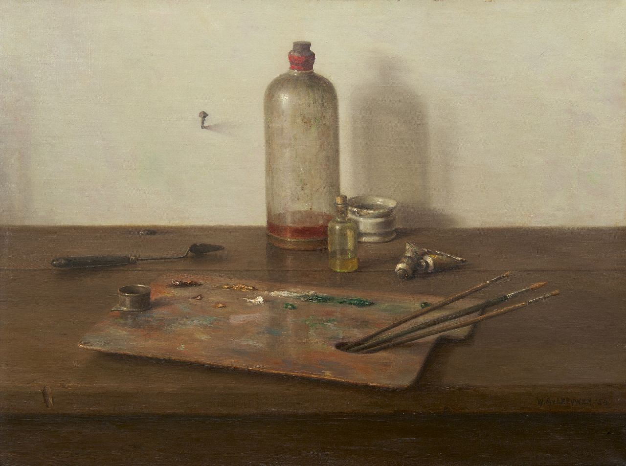 Willem van Leeuwen | Stilleben mit Malergeräten, Öl auf Leinwand, 45,2 x 60,2 cm, Unterzeichnet u.r. und datiert '54