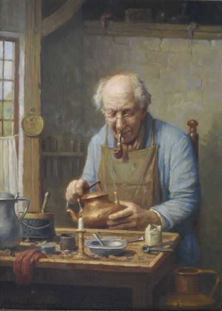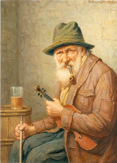Willem van Nieuwenhoven wurde 1879 in Rotterdam geboren. Nach dem Besuch der Abendklasse an der dortigen Akademie ging er nach Heeze, wohin damals viele Landschaftsmaler und bäuerliche Interieurmaler gingen. Besonders faszinierte ihn das Leben der bäuerlichen Bevölkerung. Vermutlich zog er deshalb um 1908 ins malerische Laren. Dort konzentrierte er sich auf die Figurenmalerei in lockerem, freiem Pinselstrich. Sein Malstil wird im Laufe der Jahre immer raffinierter. Deshalb beginnt er Porträts und Handwerker zu malen: einen Schuhmacher, einen Trinker, einen Gelehrten. Van Nieuwenhoven wurde auch für seine auf Elfenbein gemalten Miniaturporträts bekannt. Der Maler war Mitglied des 'Club van 10 van Hamdorff'und der Gooischen Schildersvereeniging.