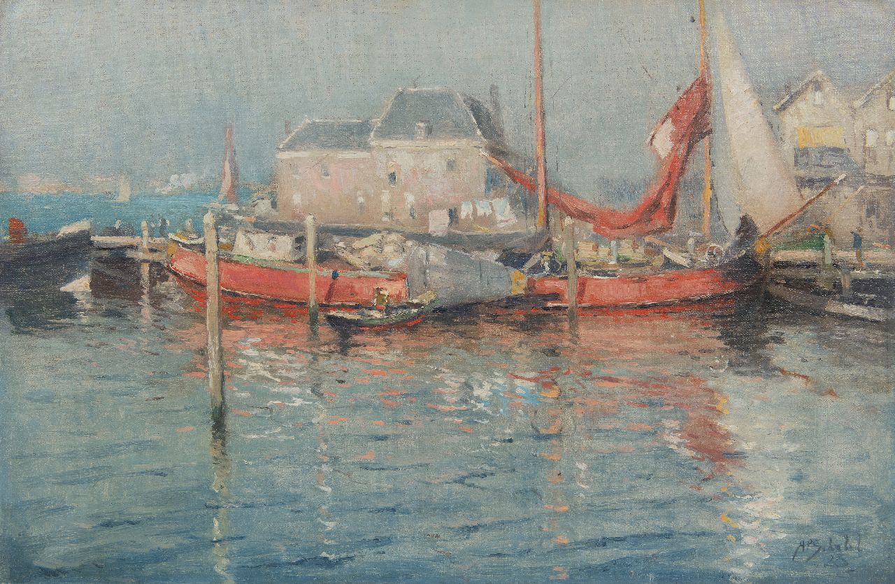 Der Maler Anthonie Pieter Schotel aus Dordrecht malte Stadtansichten und Stilleben, seine große Liebe aber war die Malerei von Wasser und Schiffen. Es war die Zuidersee mit ihren ausfahrenden kleinen Segelfischerbooten und der intimen Ruhe des fallenden Abends, die am meisten an ihm zog. Nach dem Bau des Afsluitdijk (Abschlußdeiche) arbeitete er auch in Seeland und Rotterdam. Seine Wasseransichten malte er vorzugsweise in zarter Grautönung mit von geschimmertem Licht verfließenden Formen. In den Jahren 1923, 1924 und 1936 reiste er nach Frankreich. namentlich nach der Normandie, Bretagne und der Riviera, aber auch nach Paris, wo farbenreiche Stadtansichten zustande kamen.