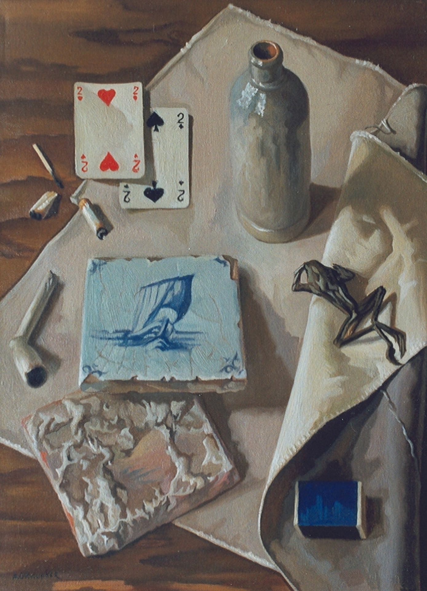 Der Rotterdamer Ab Knupker ist vor allem als Stillleben-, Porträt- und Landschaftsmaler bekannt. 1943 begann er sein Studium an der Akademie der bildenden Künste in Rotterdam, das durch seine Deportation als Zwangsarbeiter nach Deutschland jäh unterbrochen wurde. Als er 1945 nach Rotterdam zurückkehrte, setzte er seine Ausbildung an der Akademie fort, wo er sorgfältig lernte, Stillleben und Modelle zu zeichnen. Knupker begann als Realist, entwickelte sich aber nach seinem Studium in Richtung Surrealismus. Seine geduldige Arbeitsweise und die Faszination für die Materialien, mit denen er arbeitete, führten zu wunderschönen Stillleben und Portraits. Ab den frühen 1970er Jahren entstanden auch Serien von Zeichnungen und Aquarellen mit politisch kritischem Charakter. Meer over deze brontekstBrontekst vereist voor aanvullende vertaalinformatie Feedback sturen Zijvensters