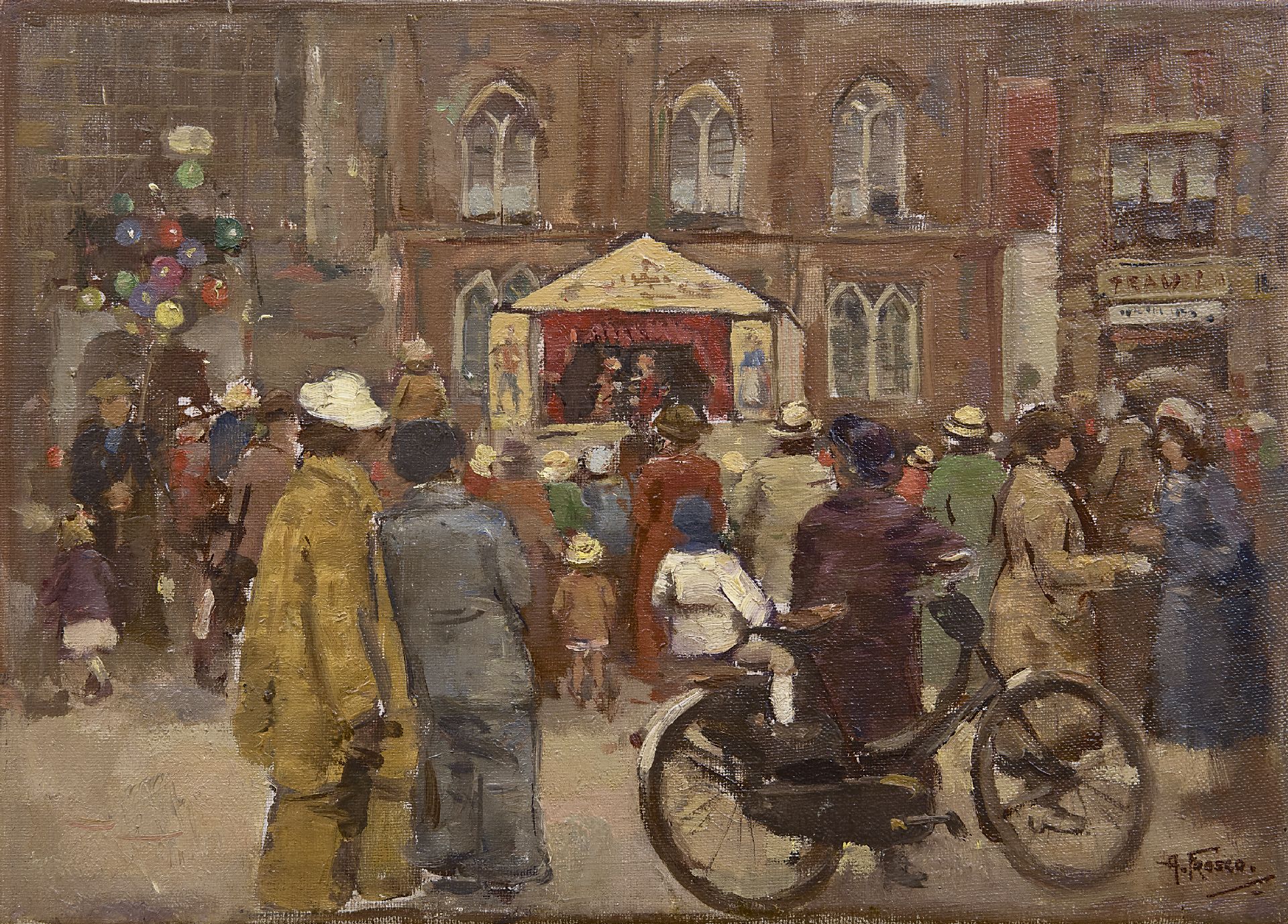 Der jung verstorbene Haager Maler Abraham Fresco hinterließ ein kleines, aber feines Oeuvre. Bereits in der Grundschule fiel sein zeichnerisches Talent auf und auf Anraten seiner Lehrer ging er zunächst an die Koninklijke Academie van Beeldende Kunsten in Den Haag und dann an die Rijksacademie van Beeldenden Kunst in Amsterdam. 1928 – Abraham war damals 25 Jahre alt – wurde er in der jüdischen Wochenzeitung De Vrijdagavond als „sehr bescheidener, ernsthafter, fleißiger junger Mann“ beschrieben, der eine „große Zukunft“ hatte. Anfangs war Fresco hauptsächlich als Porträtmaler tätig, konzentrierte sich später aber immer mehr auf das Malen von Stadtleben und Genreszenen. Seine ruhigen Plätze, belebten Einkaufsstraßen und Darstellungen von Volksfesten sind geprägt von kräftigem Pinselstrich und leuchtenden Farben. Abraham Fresco, seine Frau Debora Engelsman und ihre Tochter Marga wurden 1942 verhaftet und deportiert. Sie wurden am 19. November 1942 in Auschwitz ermordet.