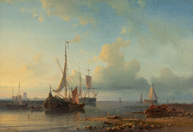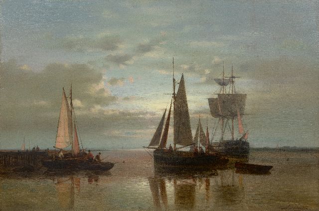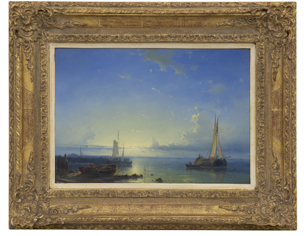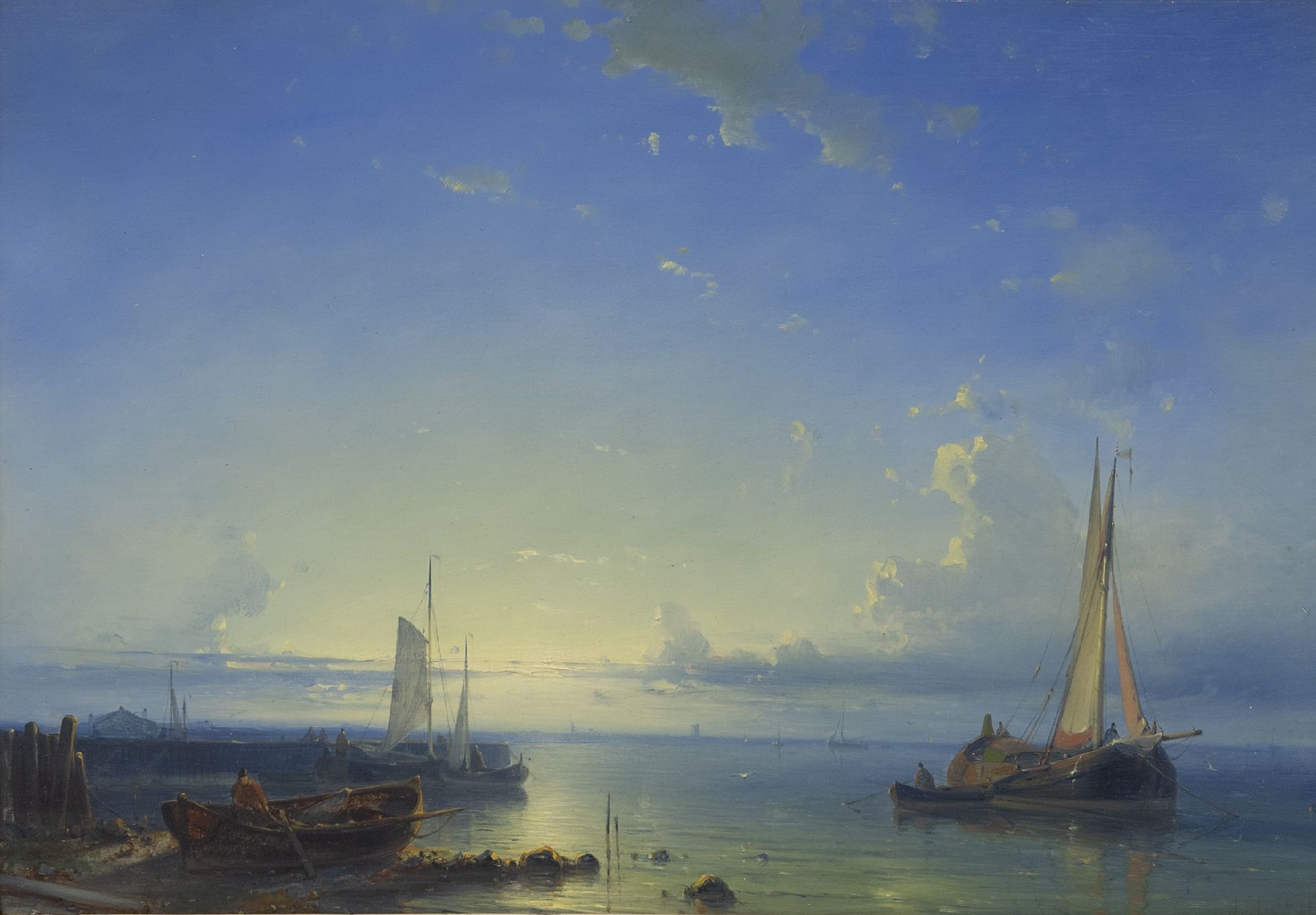 Abraham Hulk Kunstwerk • Gemälde • zuvor zu verkaufen Angedockte Plattboden Boote bei Sonnenuntergang
