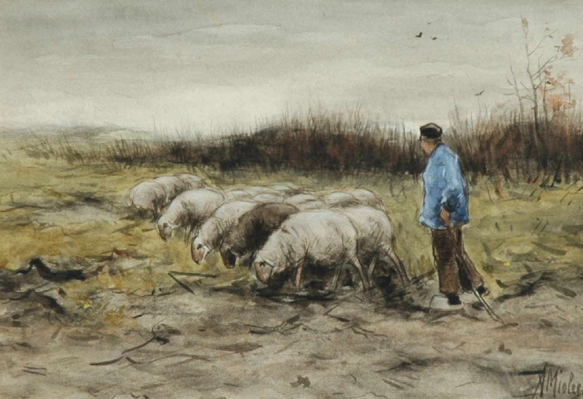 Adriaan Miolée Kunstwerk • Aquarell • Zeichnung • zuvor zu verkaufen A shepherd with his flock of sheep