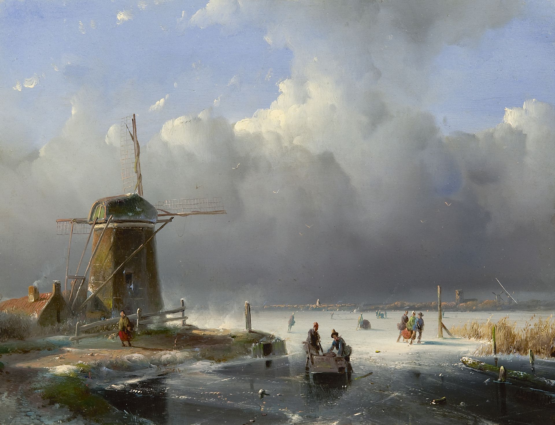 Adriaan Vrolijk Kunstwerk • Gemälde • zuvor zu verkaufen A winterlandscape with skaters near a mill