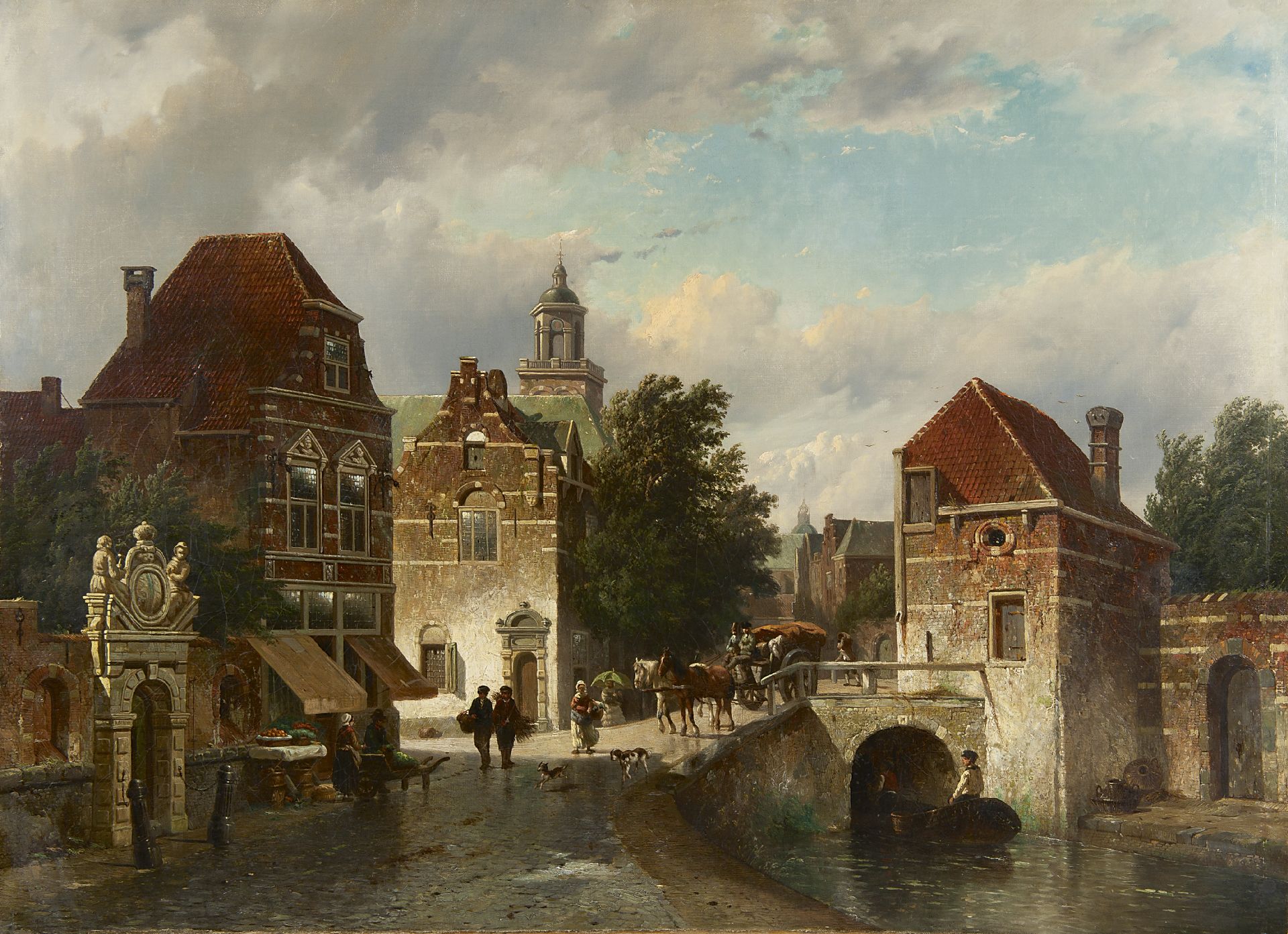 Adriaan Vrolijk Kunstwerk • Gemälde • zuvor zu verkaufen Townview with the gate of the Sint Nicolaas Gasthuis of The Hague