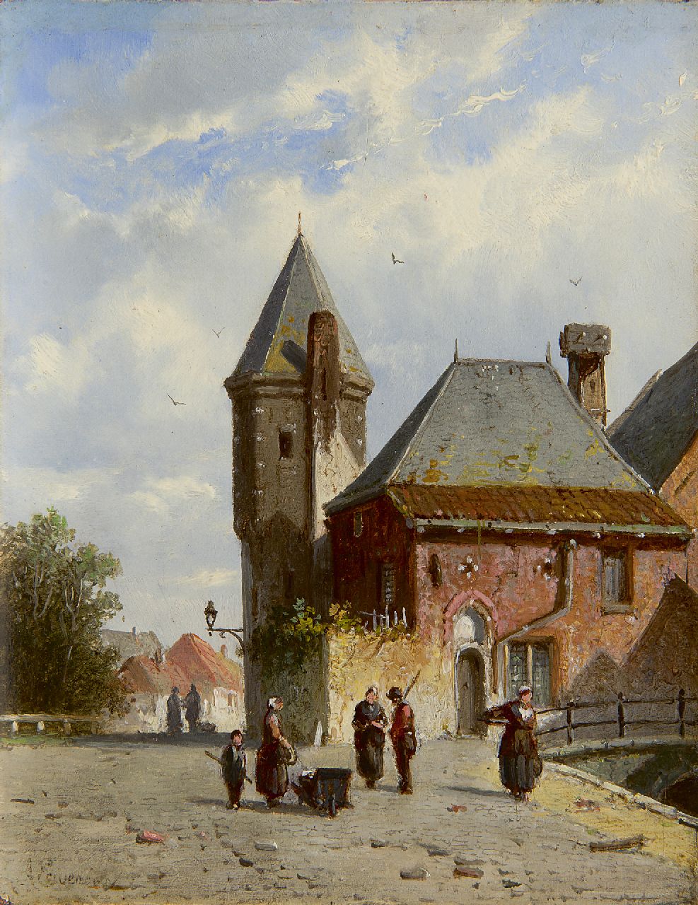 Adrianus Eversen Kunstwerk • Gemälde • zuvor zu verkaufen A sunny quai with figures and the Koppelpoort, Amersfoort