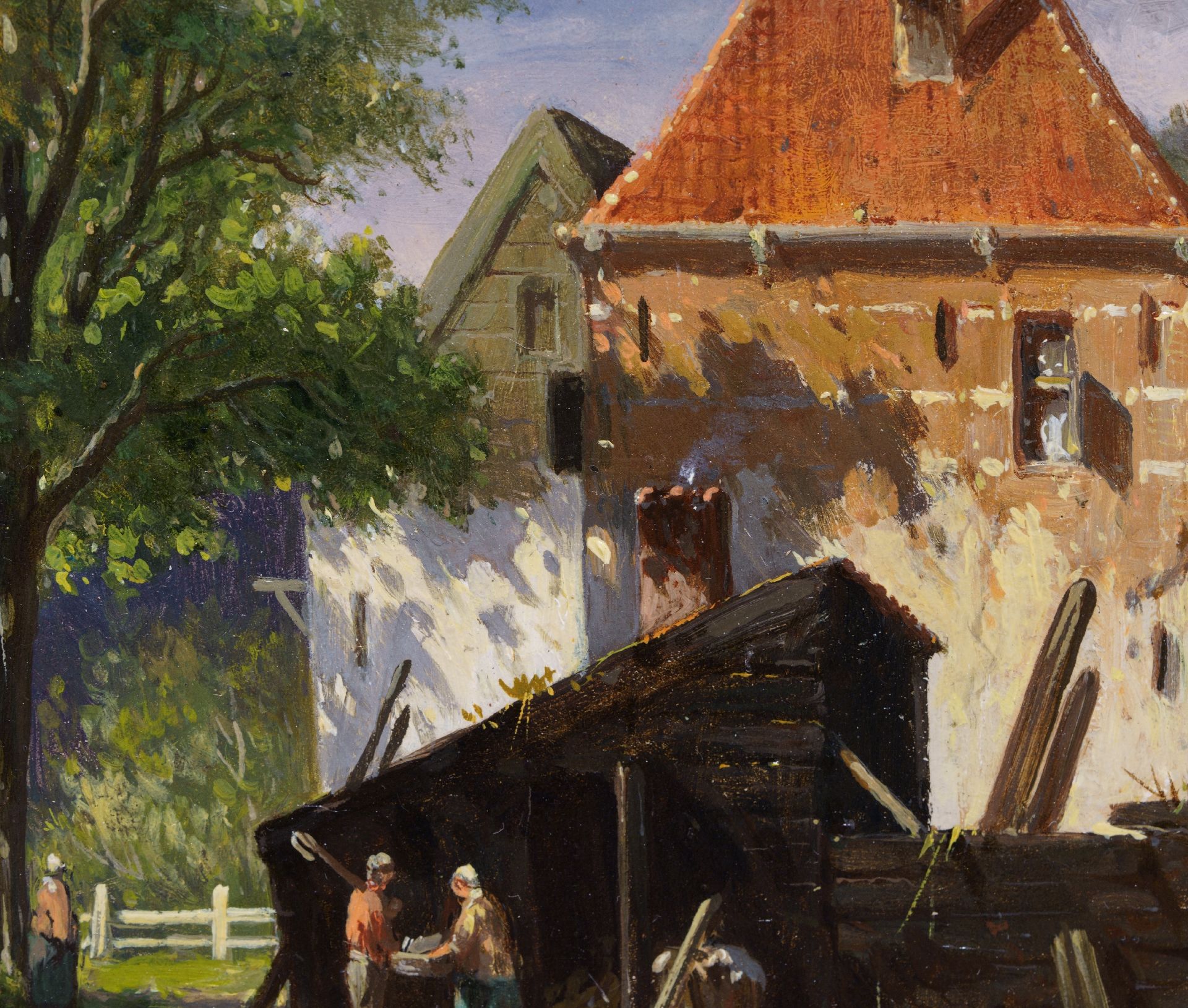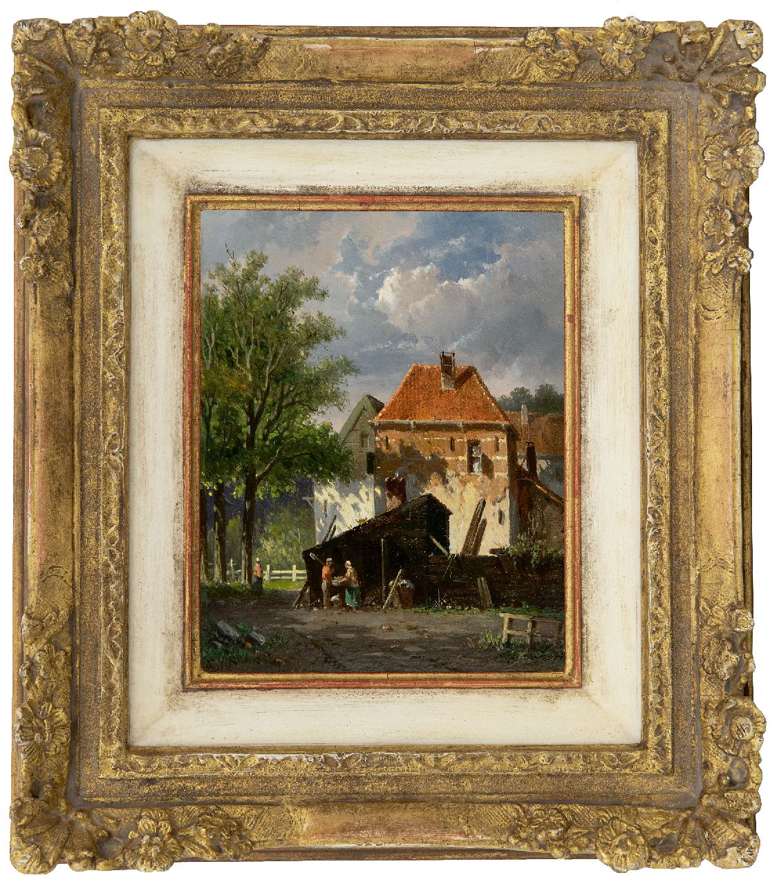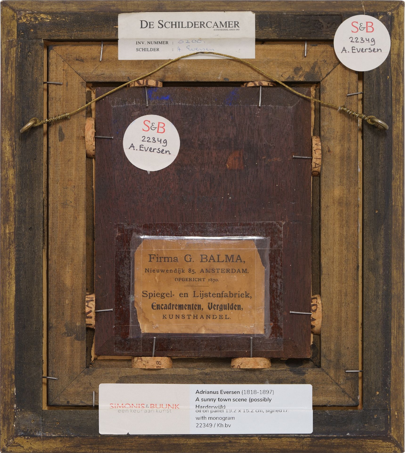 Adrianus Eversen war der begabteste Schüler von Stadtansichtenmaler Cornelis Springer. Von seinem Lehrmeister lernte er den kompositorischen Aufbau, Ausarbeitung der Details und die warme Farbenpalette. In der Wahl seiner Gegenstände war er aber freier. Malte Springer vor allen Dingen „Porträts“ von realen Gebäuden und Stadtteilen, Eversen arrangierte seine Dörfer und Gassen meistens so, dass eine schöne Stadtansicht entstand.