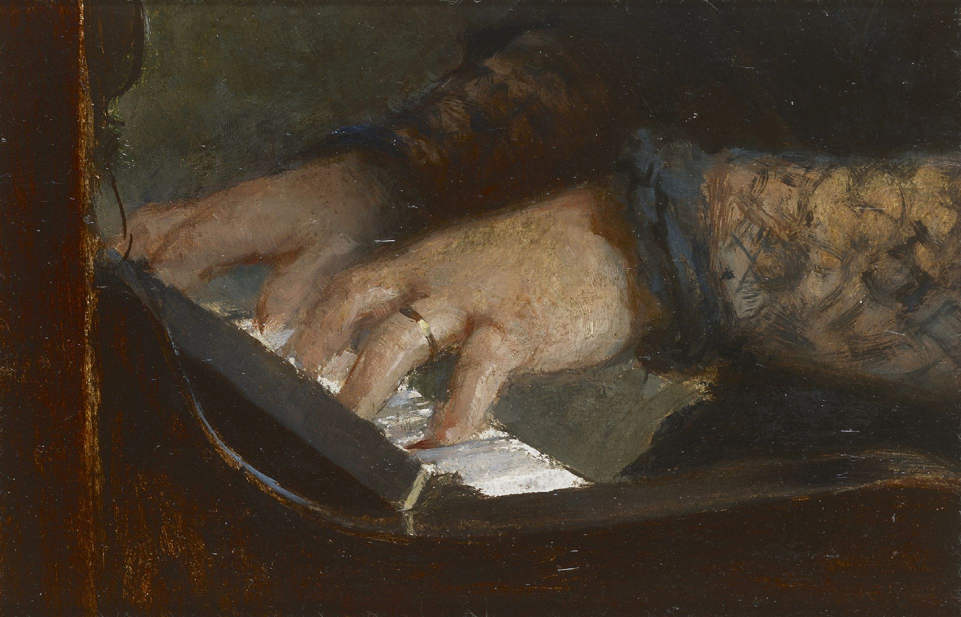 Albert Lang Kunstwerk • Gemälde • zuvor zu verkaufen Klavierspielende Marie Lang, Frau des Malers