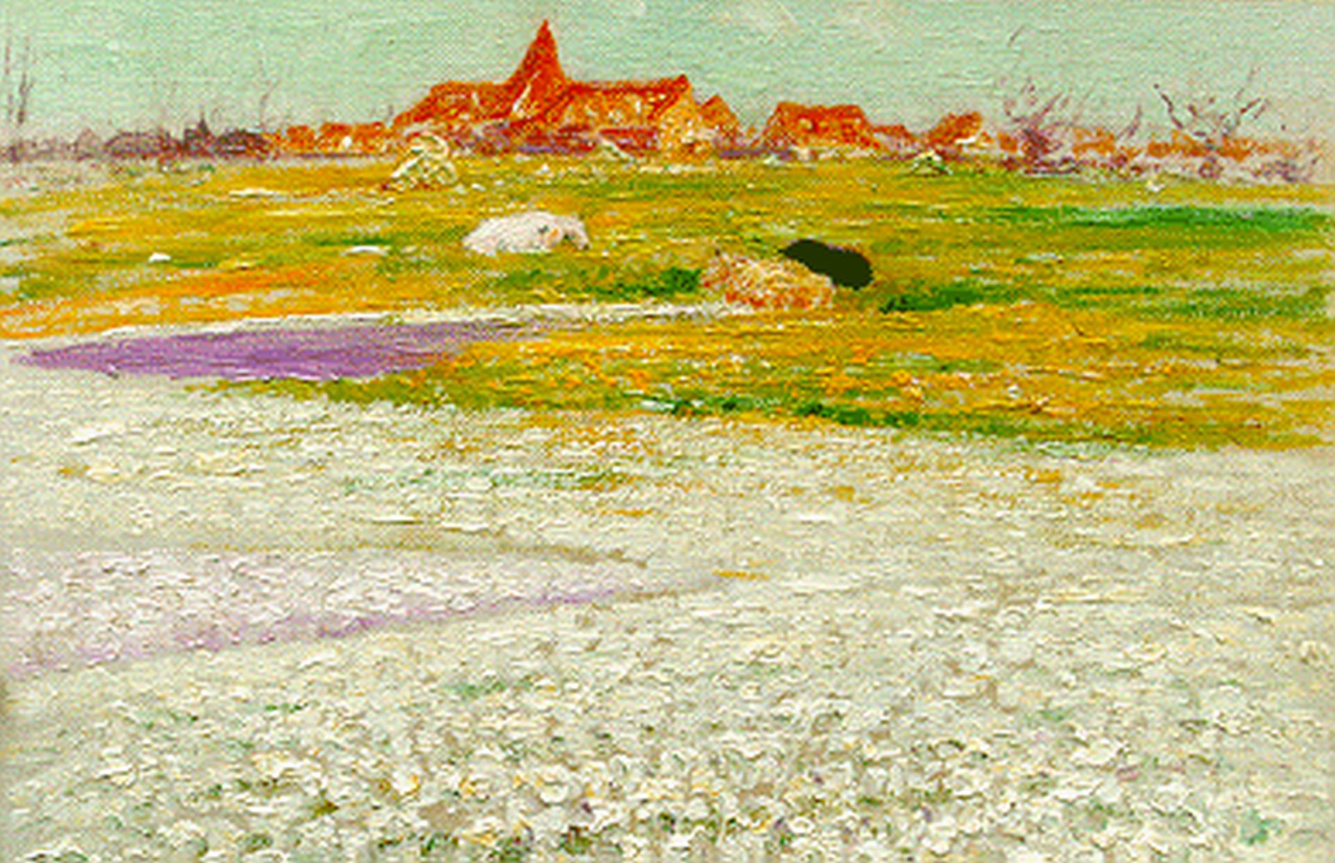 Albert Lefebvre Kunstwerk • Gemälde • zuvor zu verkaufen Bulb fields, a village in the distance
