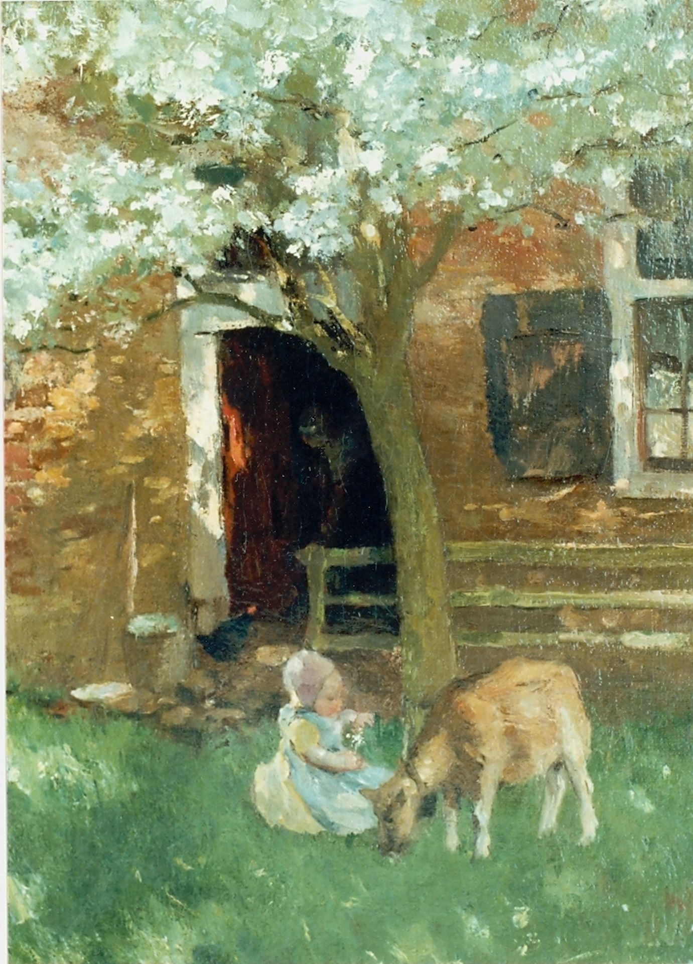 Albert Neuhuys Kunstwerk • Gemälde • zuvor zu verkaufen A yard with a girl and goat
