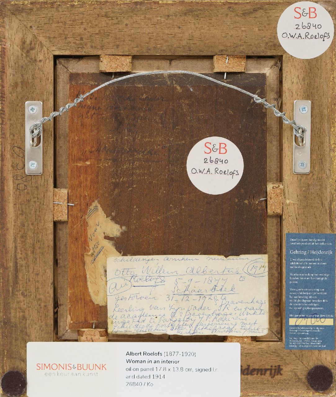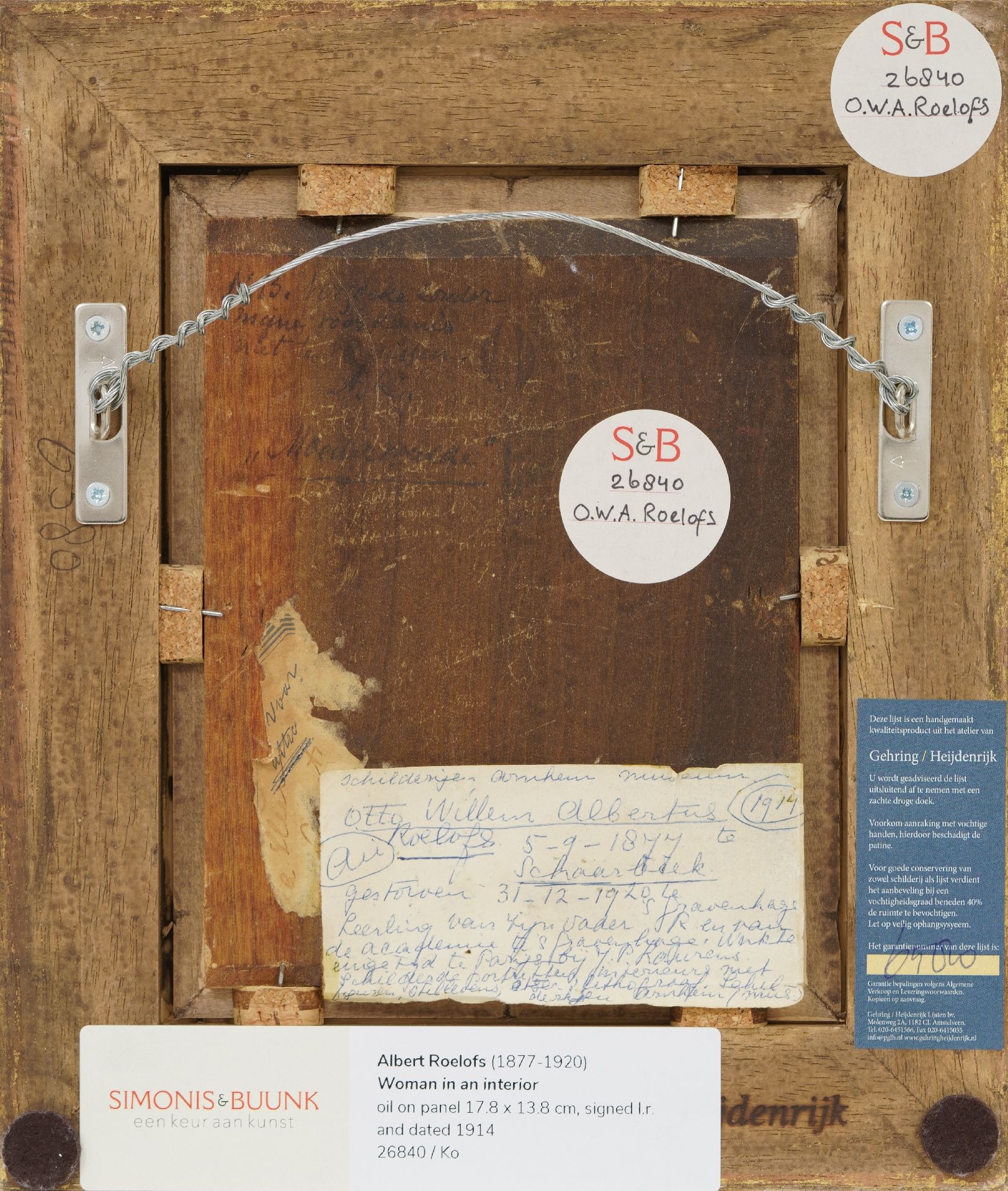 Albert Roelofs wurde 1877 in Brüssel geboren als Sohn des berühmten Landschaftsmalers Willem Roelofs. Nach den ersten Mal- und Zeichenstunden durch seinen Vater besuchte er ab 1893 die Akademie im Haag. Drei Jahre später kehrte er wieder in seine Geburtsstadt zurück. Zunächst malte der junge Roelofs vor allem Stillleben, dann entwickelte er eine Vorliebe für Genrebilder und Porträts. Sein treuestes Modell war seine Frau Tjieke. Sie inspirierte ihn zu zahllosen Figurstücken, die von einem intimen, häuslichen Glück zeugten. Namentlich in Belgien waren seine Gemälde in den Kreisen der wohlhabenden Bourgeoisie sehr geliebt.