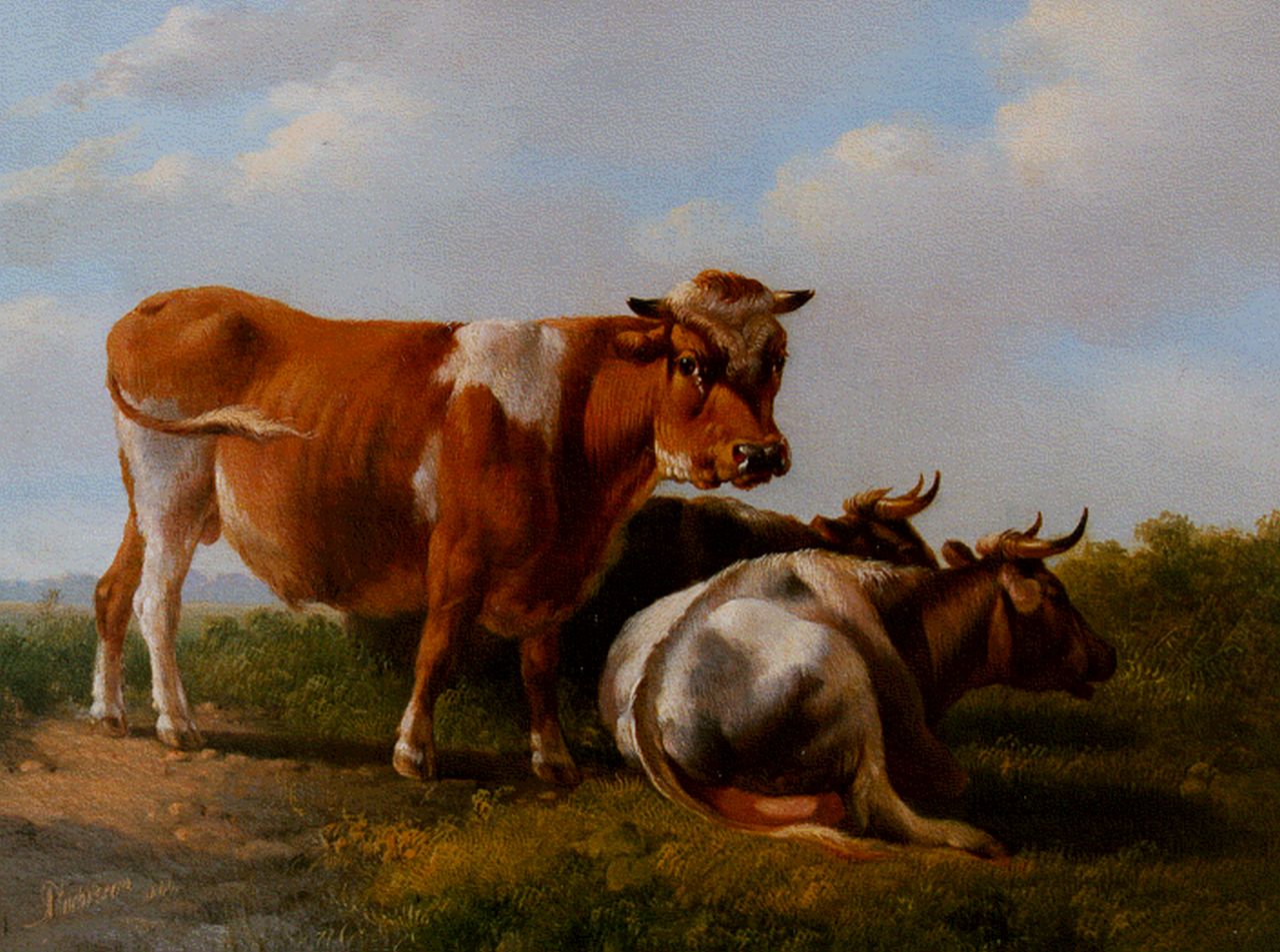Albertus Verhoesen Kunstwerk • Gemälde • zuvor zu verkaufen A bull and two cows in a meadow