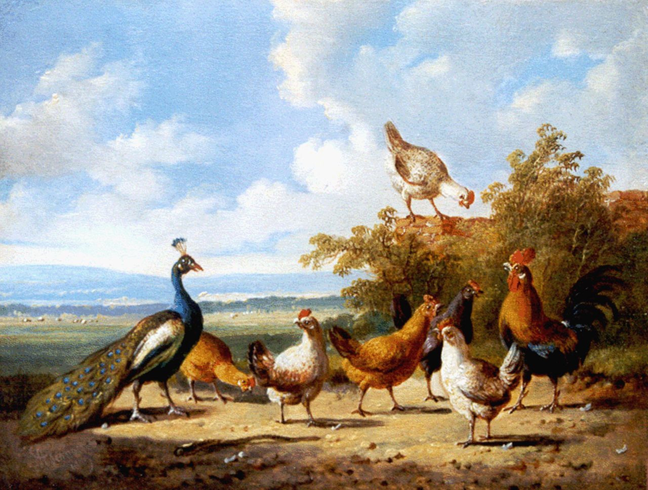 Albertus Verhoesen Kunstwerk • Gemälde • zuvor zu verkaufen A landscape with poultry and a peacock