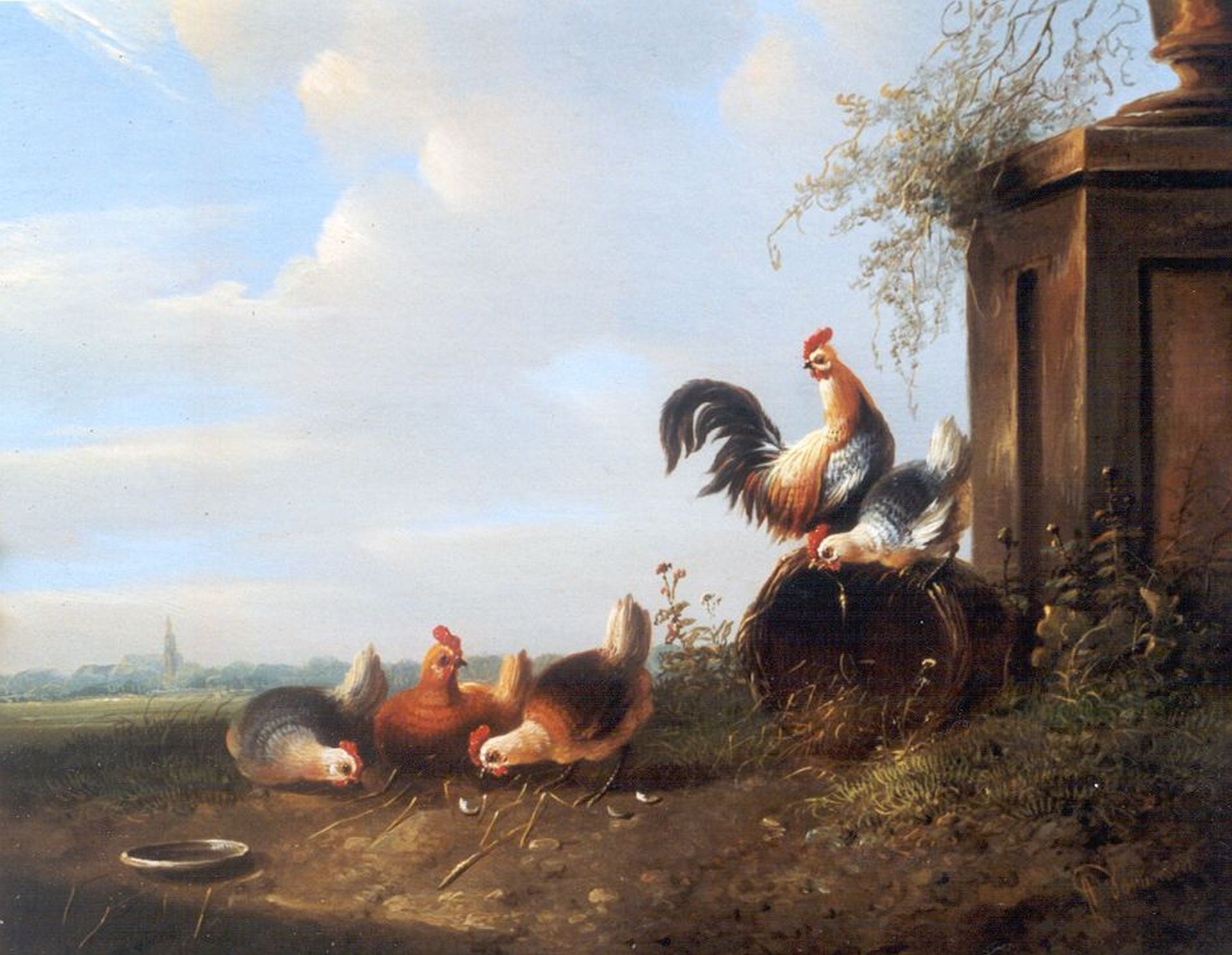Albertus Verhoesen Kunstwerk • Gemälde • zuvor zu verkaufen Chickens and a rooster in a landscape