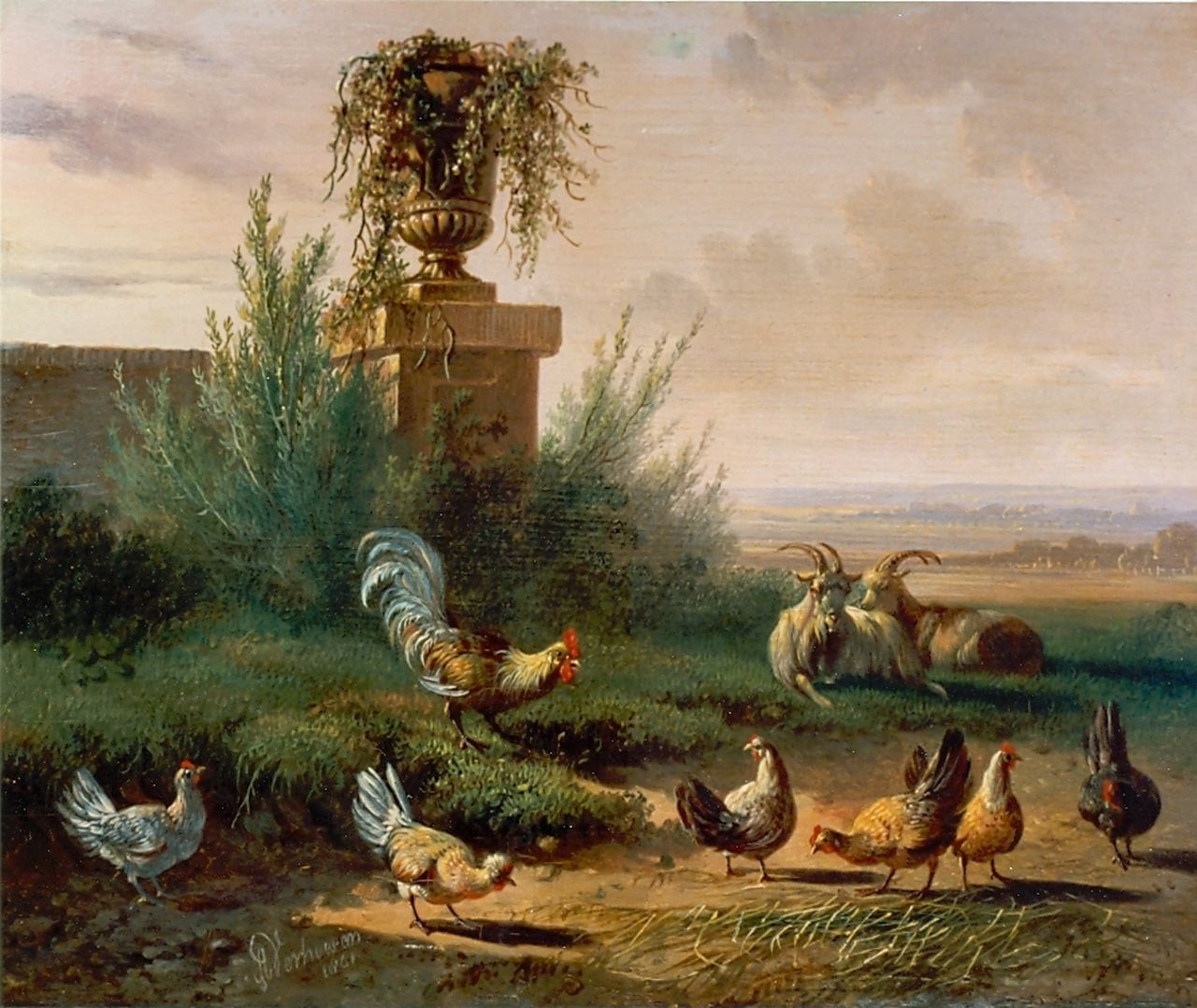 Albertus Verhoesen Kunstwerk • Gemälde • zuvor zu verkaufen Chickens in a meadow