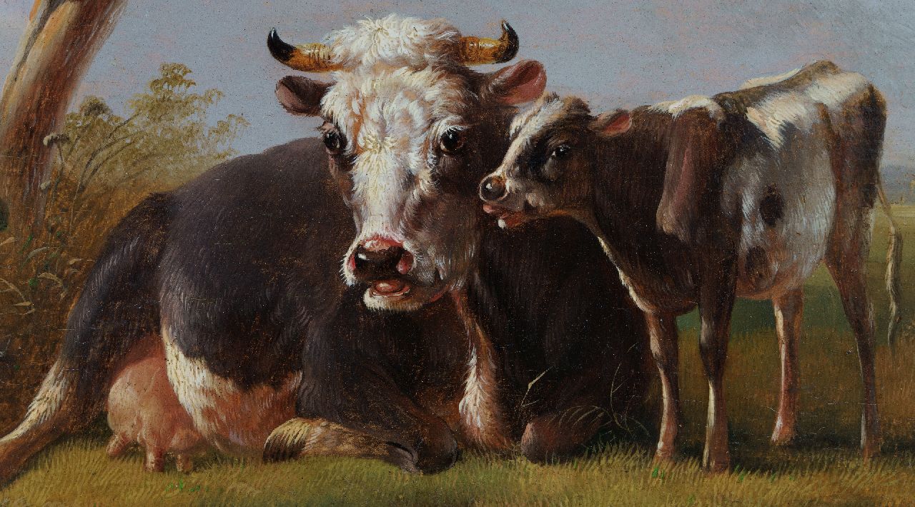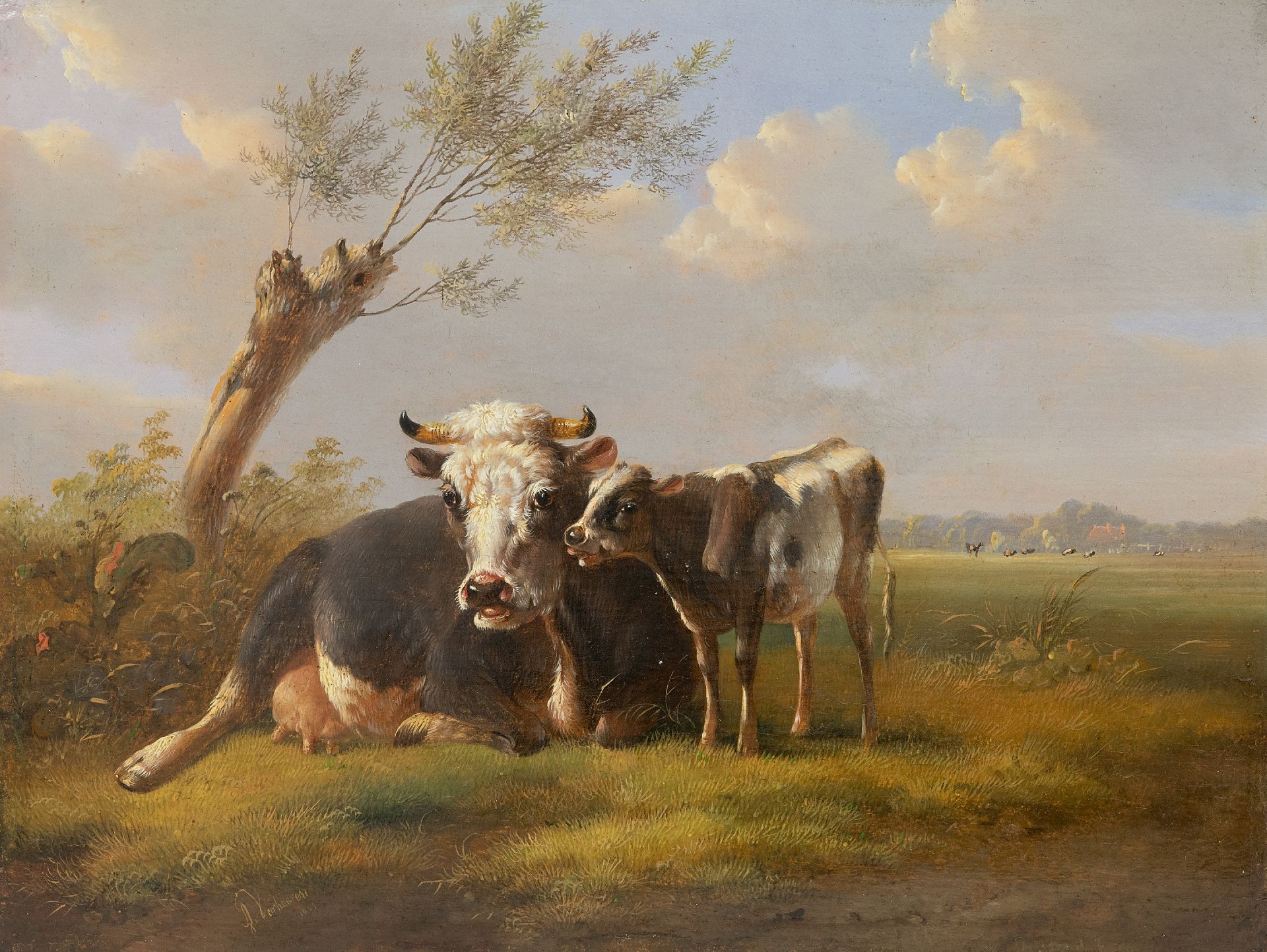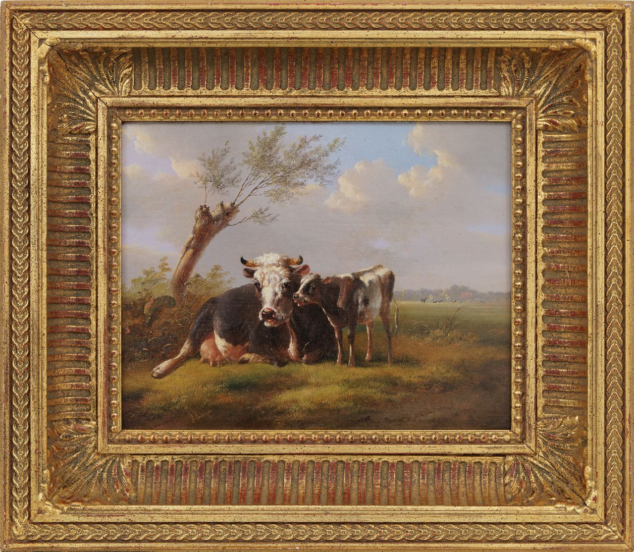 Albertus Verhoesen Kunstwerk • Gemälde • zuvor zu verkaufen Kuh und ihr Kalb in einer Wiesenlandschaft