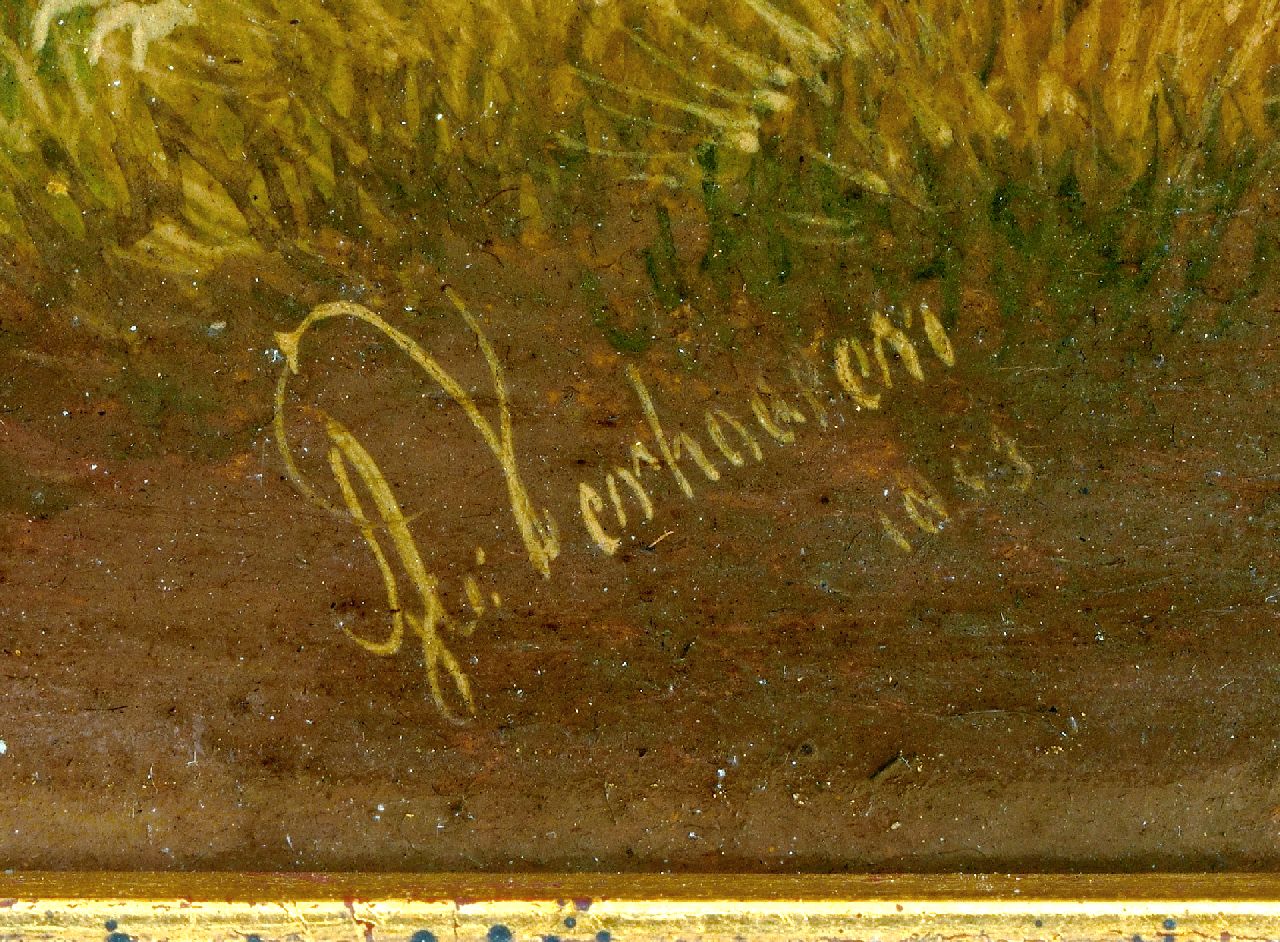 Albertus Verhoesen war ein Schüler von J. van Ravenswaay und vom Viehmaler P.G. van Os. Er lebte in Utrecht und Amersfoort und gehörte zur Malerkolonie Hilversum von 1824 bis zum Jahr 1826. Seine Spezialisierung umfasste Landschaften mit Vieh und Tierställe, er wurde aber vor allen Dingen mit seinen Federviehszenen. Während seiner Hilversumer Jahre bekam Verhoesen wahrscheinlich Unterricht von B.C. Koekkoek, der damals auch dort wohnte. In Amersfoort arbeitete Verhoesen fast zwanzig Jahre als Stadtzeichenmeister. Ausserdem war er Kunsthändler.