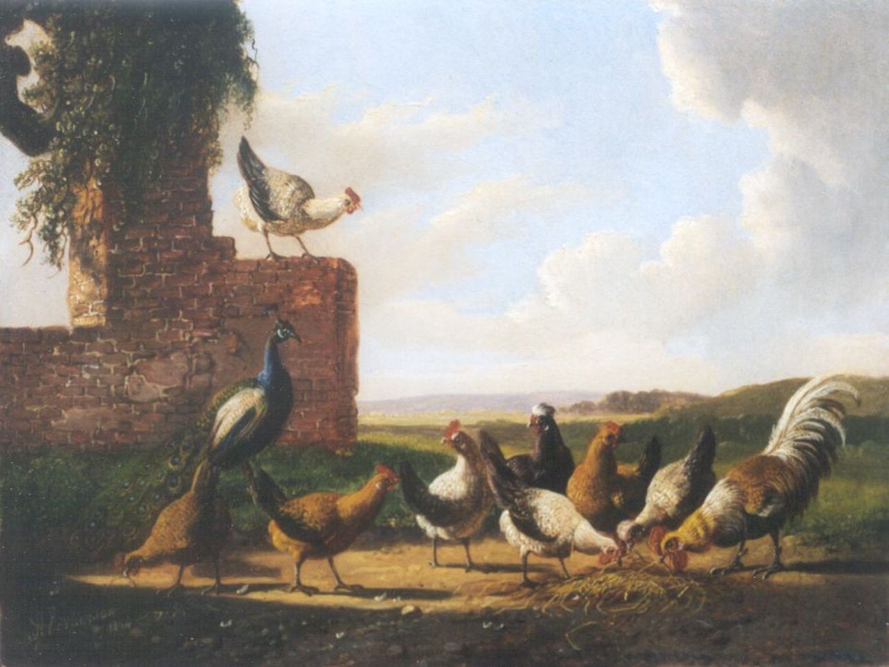 Albertus Verhoesen Kunstwerk • Gemälde • zuvor zu verkaufen Poultry and a peacock by a ruin