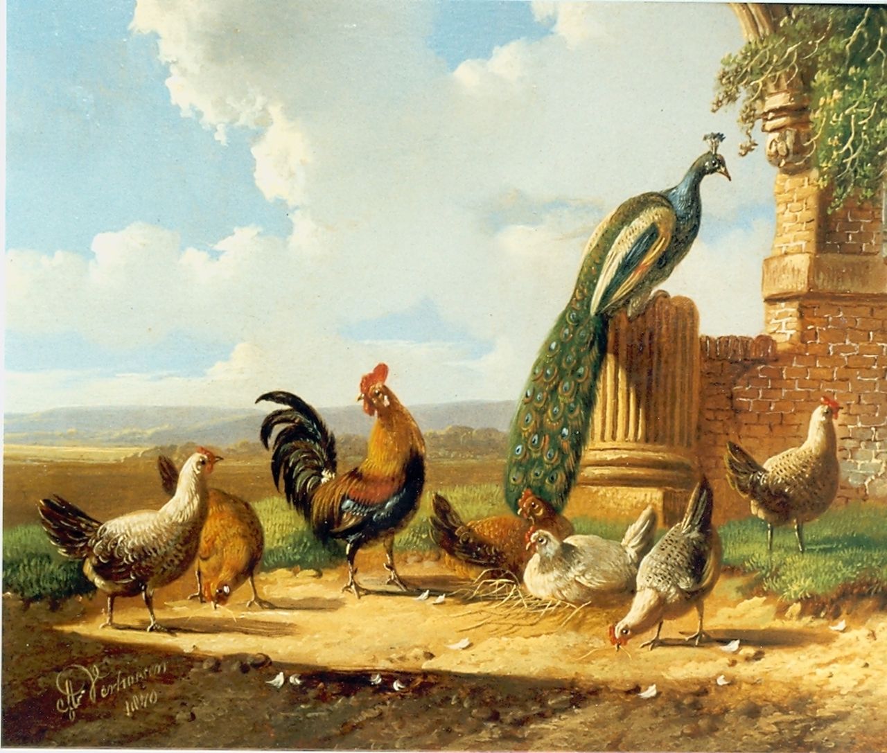 Albertus Verhoesen | Truthühner und Federvieh in einer Landschaft, Öl auf Holz, 30,5 x 37,6 cm, Unterzeichnet l.u. und datiert 1870