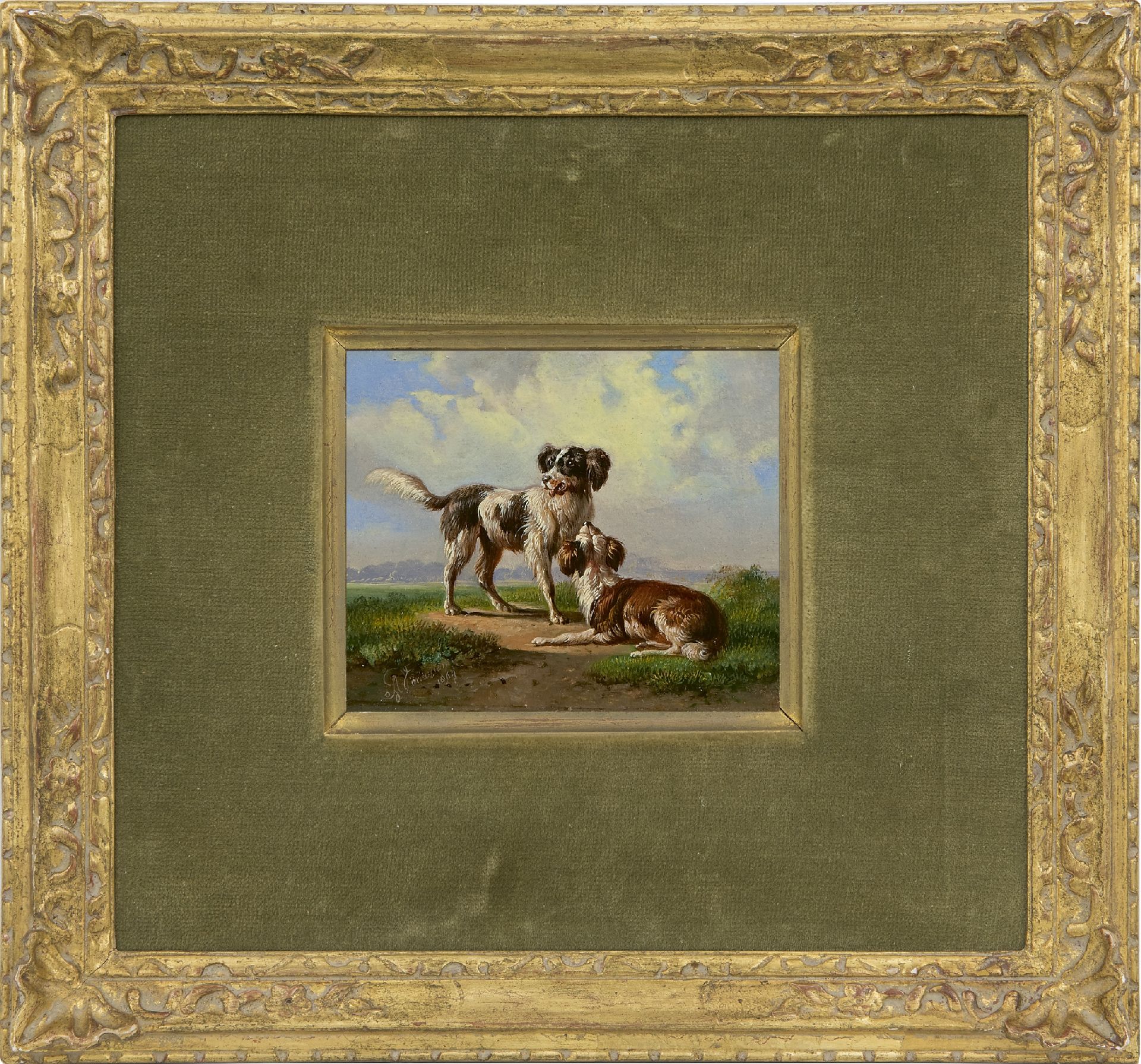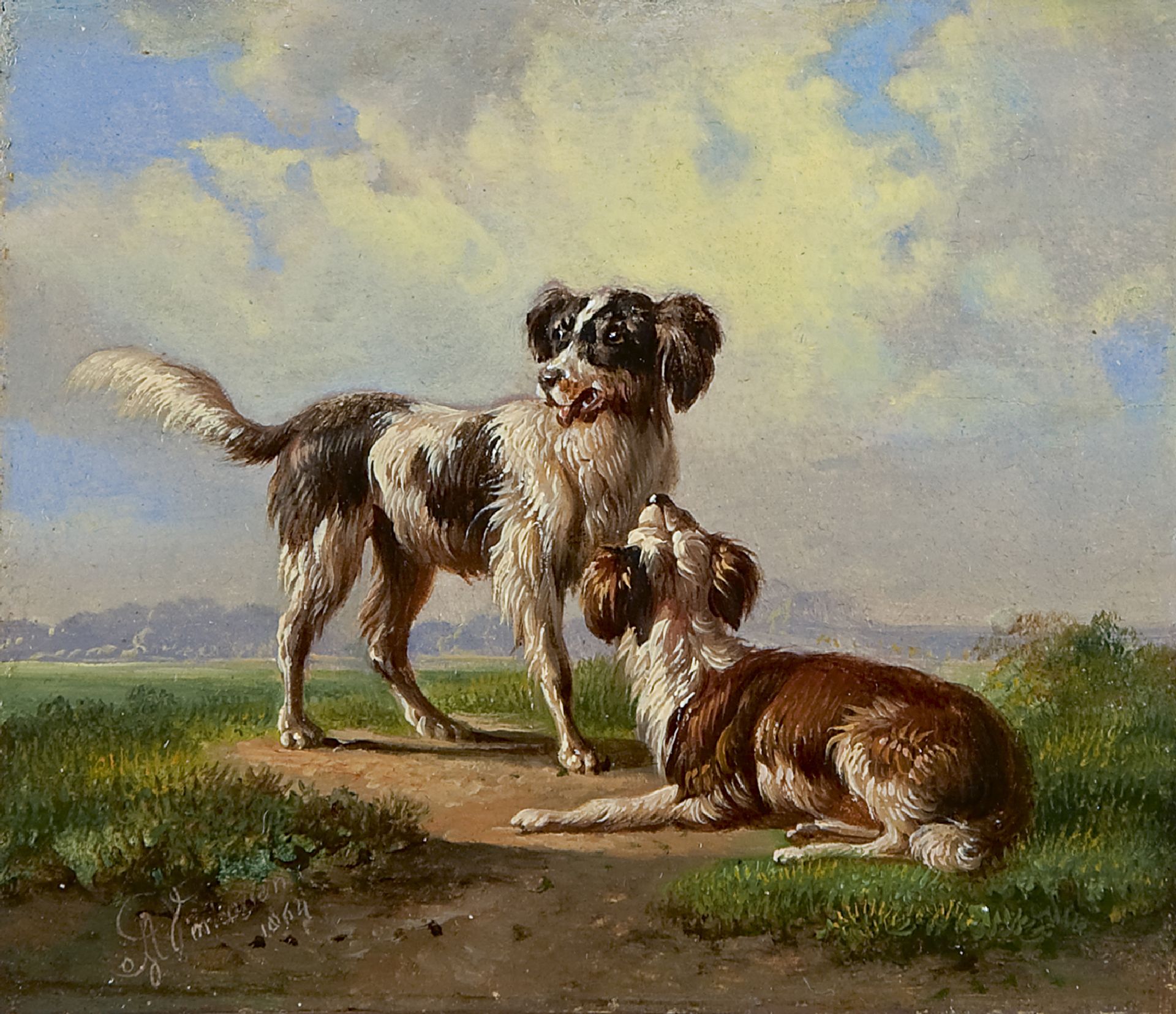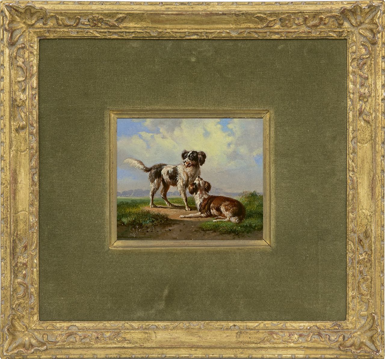 Albertus Verhoesen Kunstwerk • Gemälde • zuvor zu verkaufen Zwei Jagdhunde in einer Landschaft