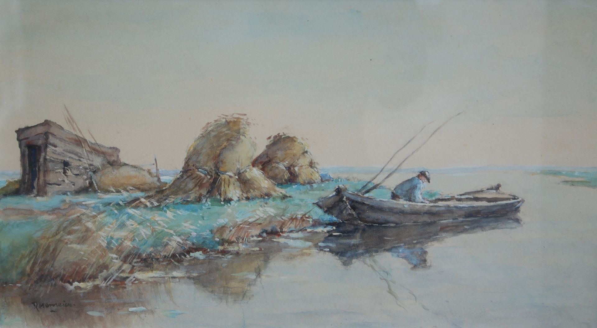 Alex Rosemeier Kunstwerk • Aquarell • Zeichnung • zu verkaufen Fischer in einem Wasserlandschaft