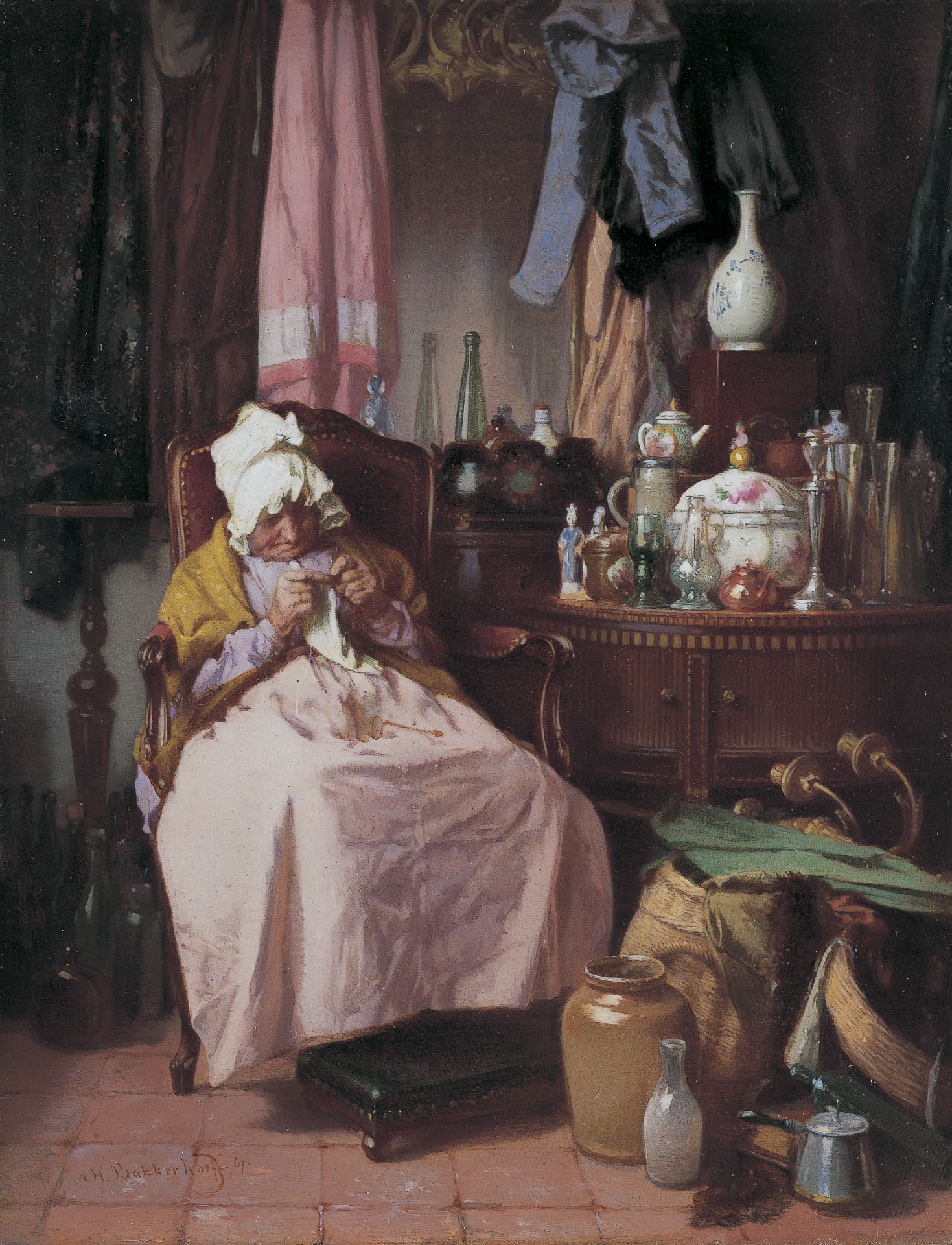 Alexander Hugo Bakker Korff wohnte und arbeitete im Haag. Anfangs malte er historische und biblische Vorstellungen. Um 1859 fing er an Genrestücke auf kleinem Format zu malen und zu zeichnen in einem äussert prezisen Stil. Es waren vor allen Dingen häusliche Szenen mit alten Jungfern, für die seine zwei unverheirateten Schwestern Modell waren. Seine Gemälde zeigen einen humorvollen, manchmal ironischen Unterton, der von sorgfältig gewählten Titeln akzentuiert wird. Er gab unter anderen J.H.van Rossum du Chattel Unterricht.