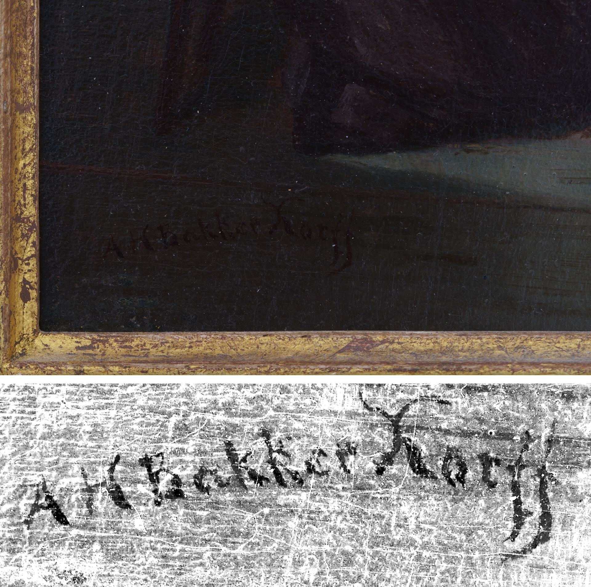 Alexander Hugo Bakker Korff wohnte und arbeitete im Haag. Anfangs malte er historische und biblische Vorstellungen. Um 1859 fing er an Genrestücke auf kleinem Format zu malen und zu zeichnen in einem äussert prezisen Stil. Es waren vor allen Dingen häusliche Szenen mit alten Jungfern, für die seine zwei unverheirateten Schwestern Modell waren. Seine Gemälde zeigen einen humorvollen, manchmal ironischen Unterton, der von sorgfältig gewählten Titeln akzentuiert wird. Er gab unter anderen J.H.van Rossum du Chattel Unterricht.