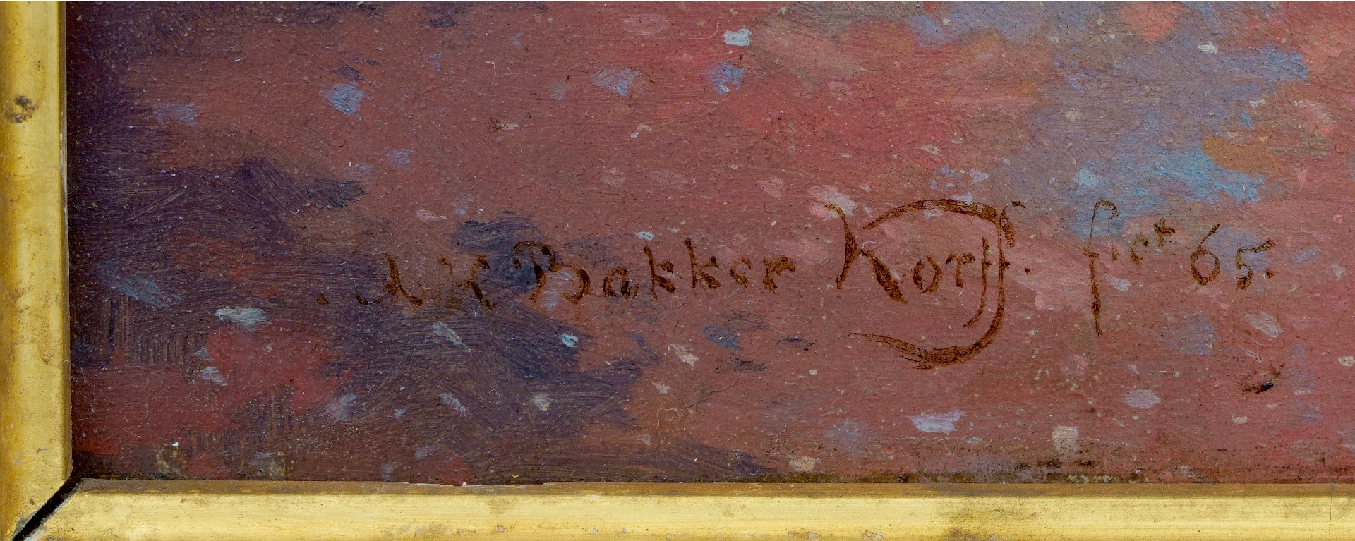 Alexander Hugo Bakker Korff wohnte und arbeitete im Haag. Anfangs malte er historische und biblische Vorstellungen. Um 1859 fing er an Genrestücke auf kleinem Format zu malen und zu zeichnen in einem äussert prezisen Stil. Es waren vor allen Dingen häusliche Szenen mit alten Jungfern, für die seine zwei unverheirateten Schwestern Modell waren. Seine Gemälde zeigen einen humorvollen, manchmal ironischen Unterton, der von sorgfältig gewählten Titeln akzentuiert wird. Er gab unter anderen J.H.van Rossum du Chattel Unterricht.