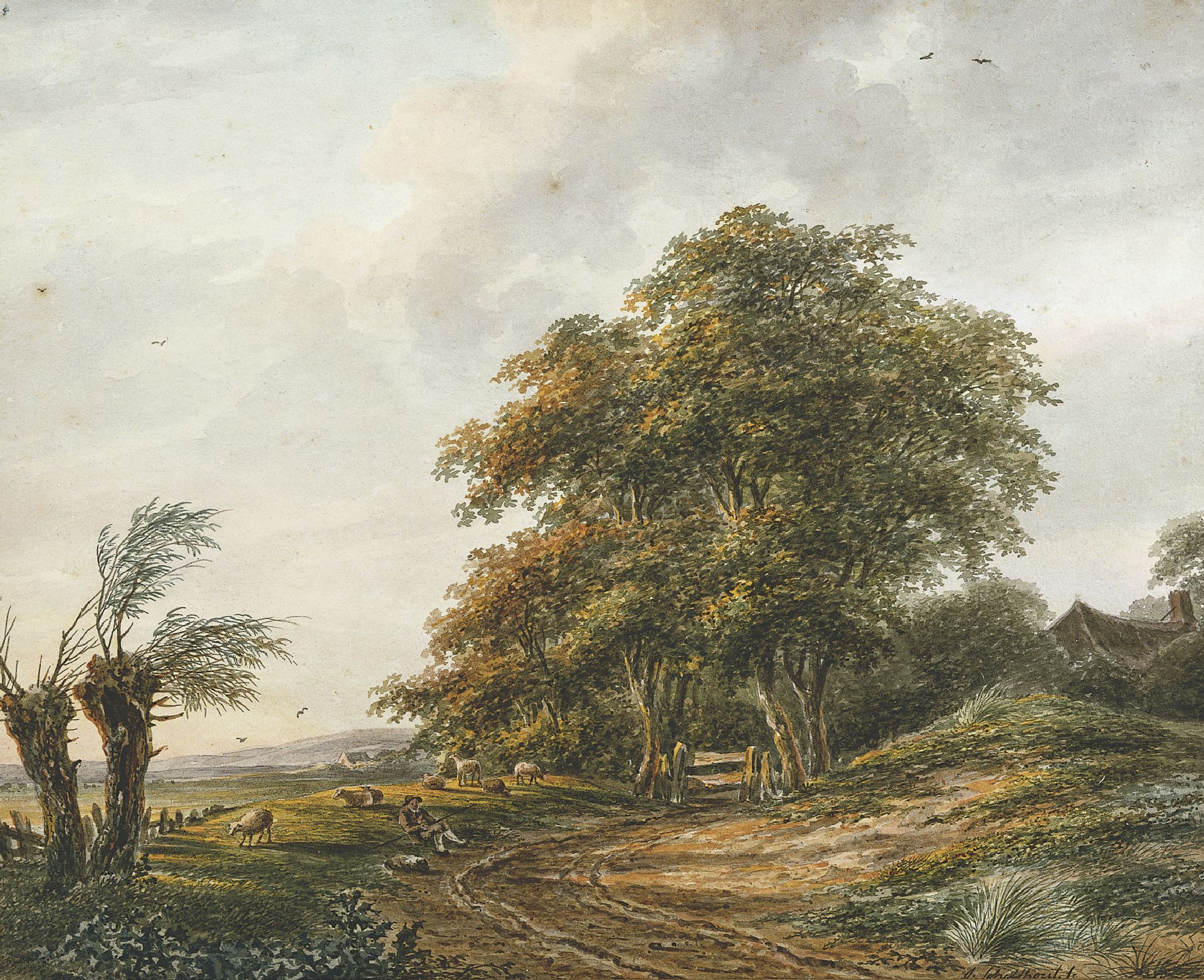 Andreas Schelfhout Kunstwerk • Aquarell • Zeichnung • zuvor zu verkaufen A shepherd with his flock