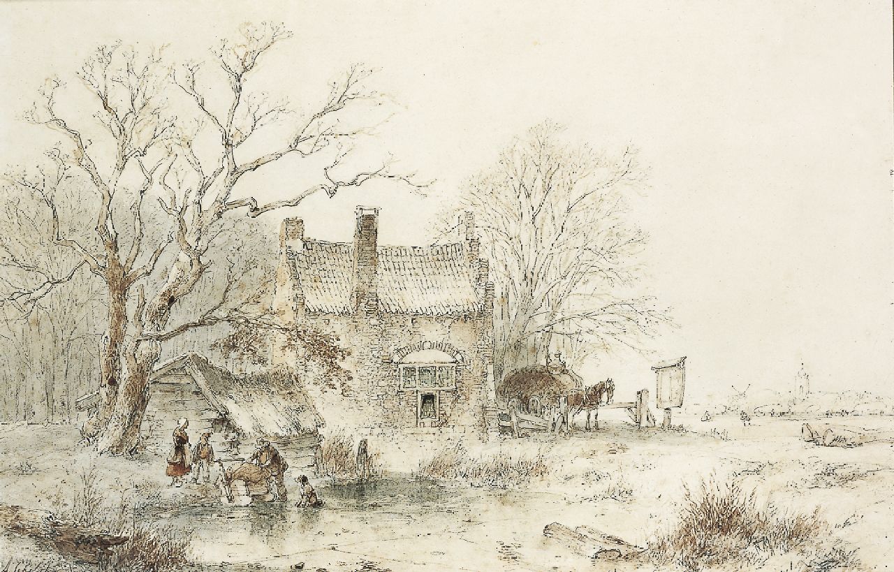 Andreas Schelfhout Kunstwerk • Aquarell • Zeichnung • zuvor zu verkaufen A winter landscape with figures on a frozen waterway