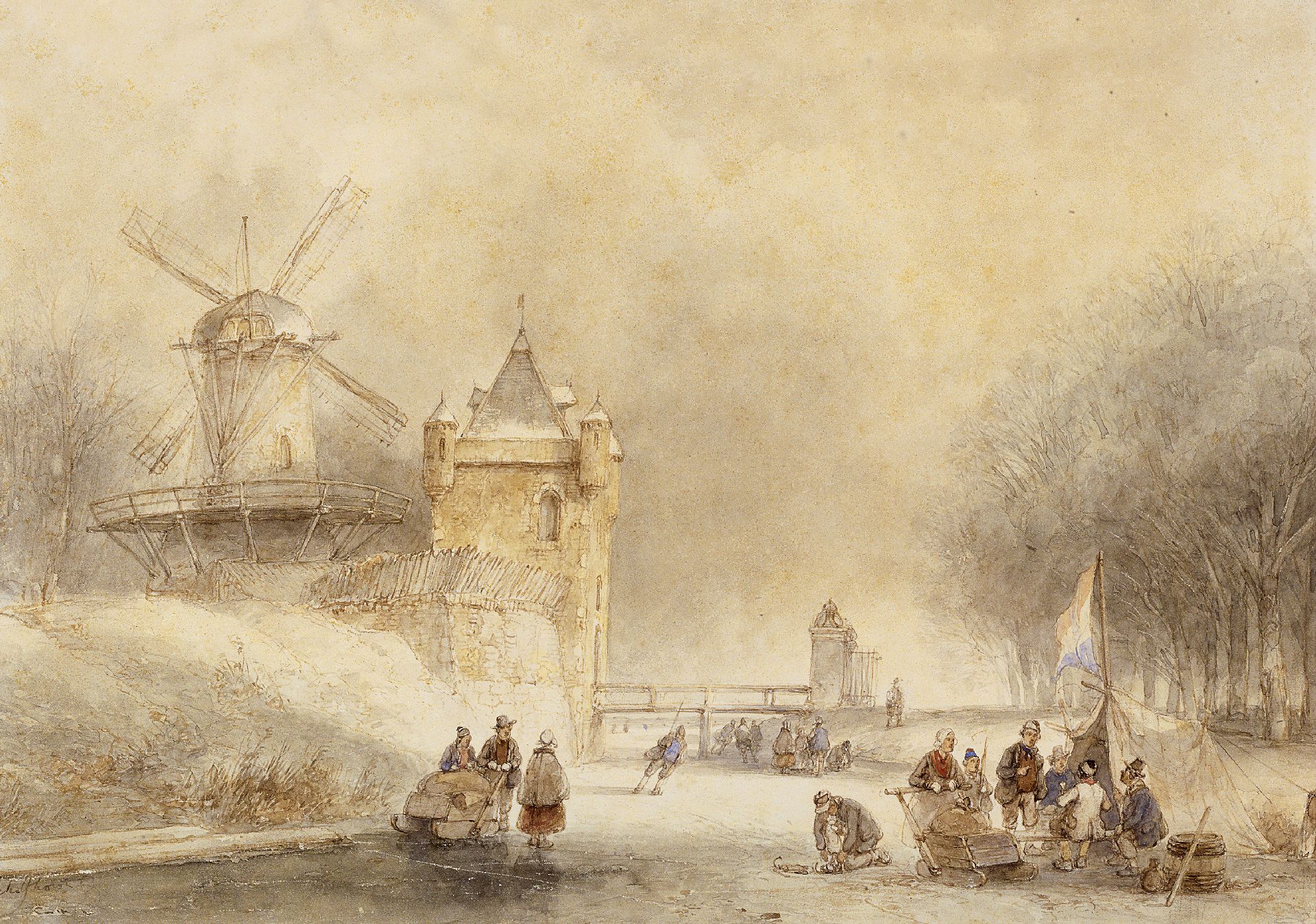 Andreas Schelfhout Kunstwerk • Aquarell • Zeichnung • zuvor zu verkaufen Eisvergnügen bei einem Ringwall