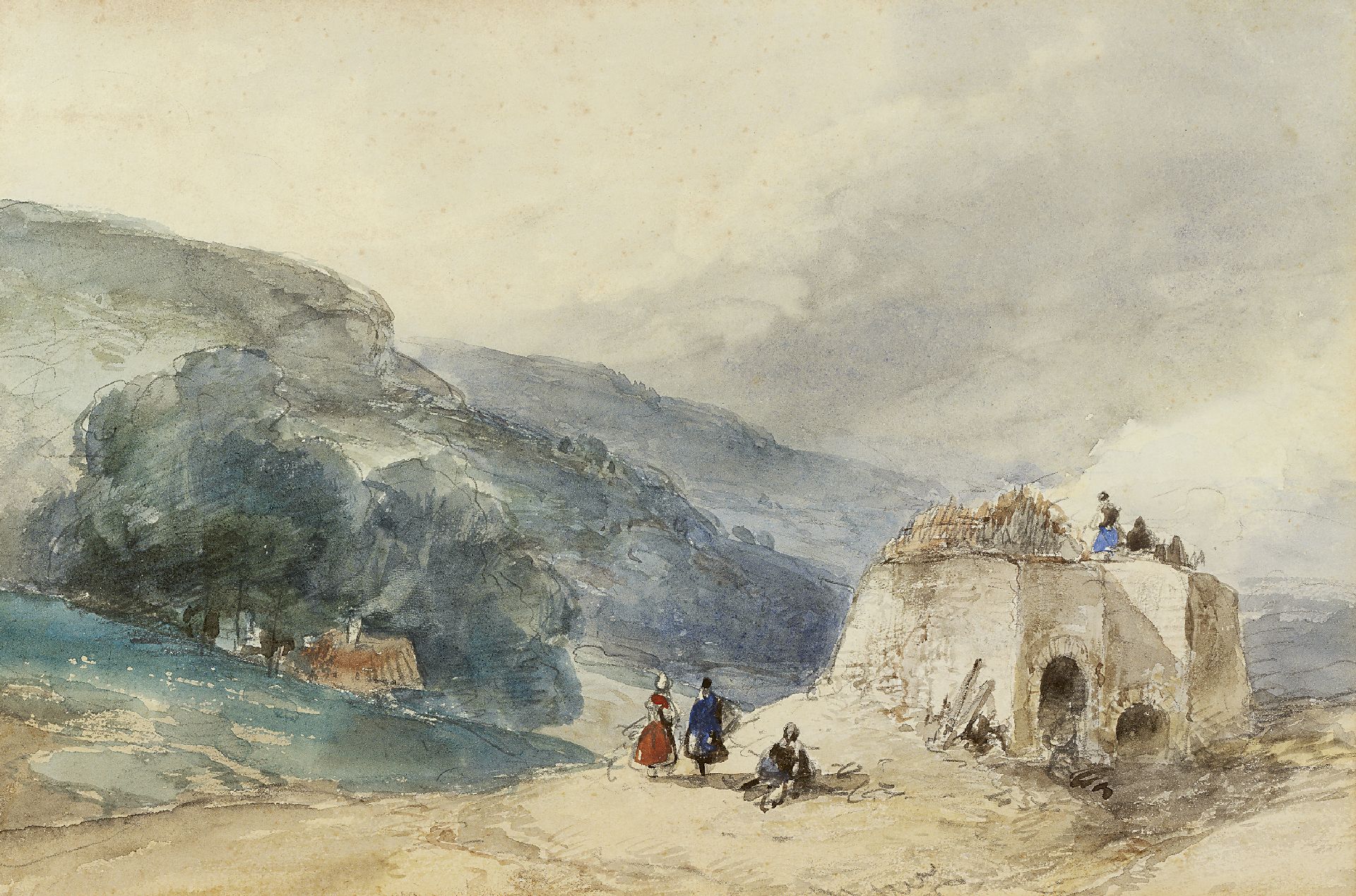 Figuren bei einer Kalkhütte in einer Hügellandschaft
