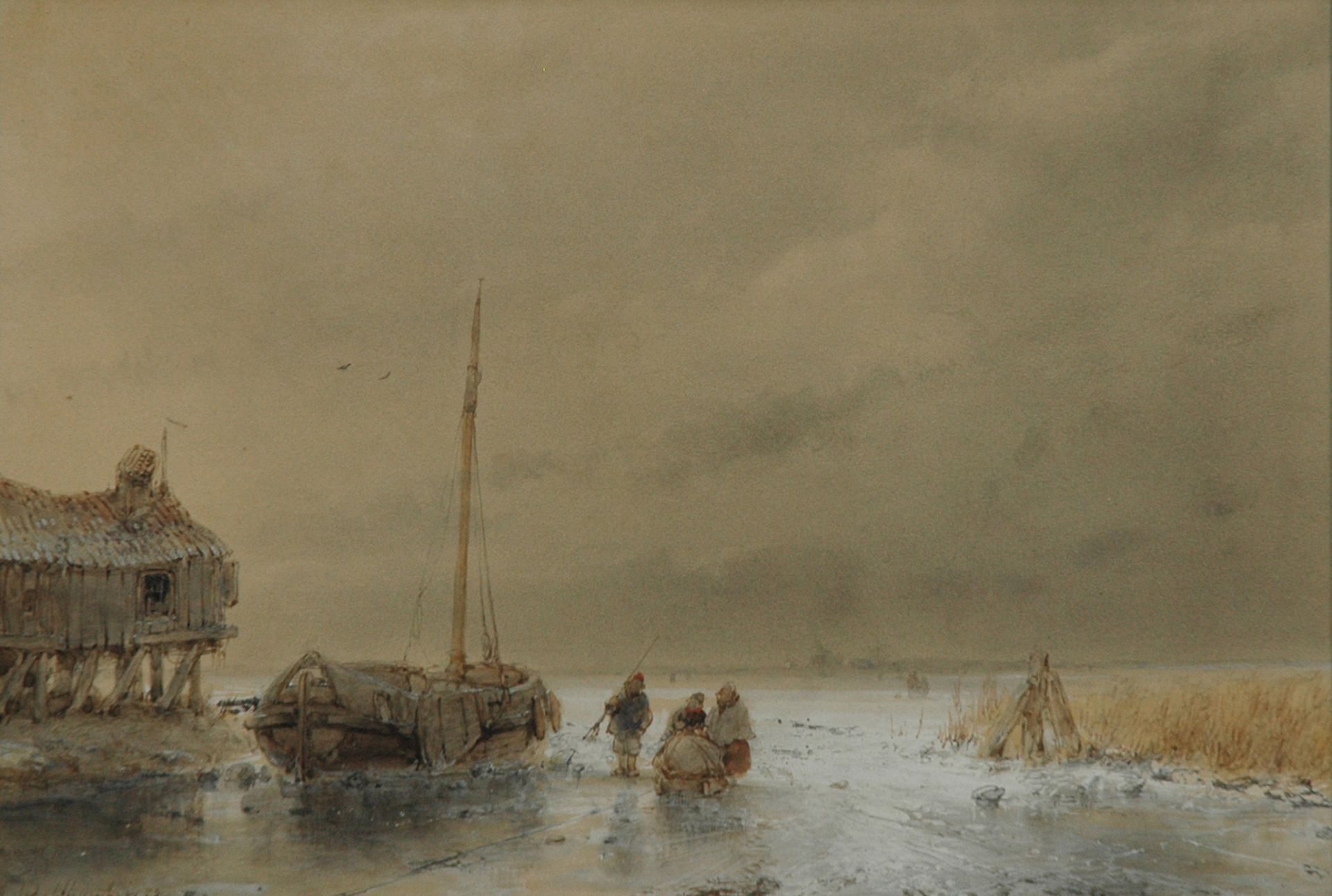 Andreas Schelfhout Kunstwerk • Aquarell • Zeichnung • zuvor zu verkaufen Figures on the ice by a fisherman's hut