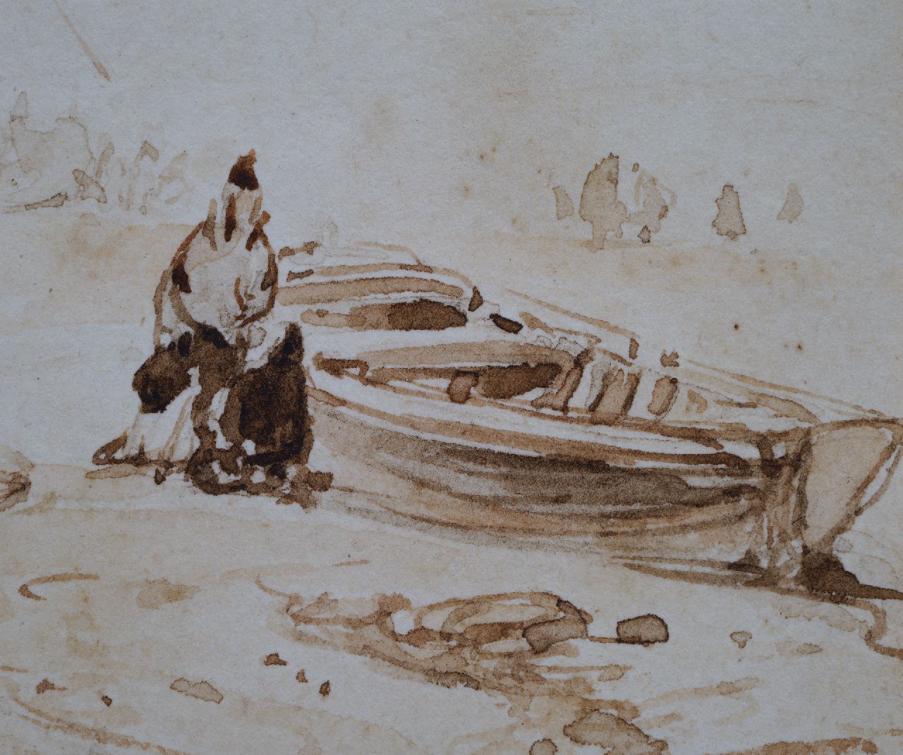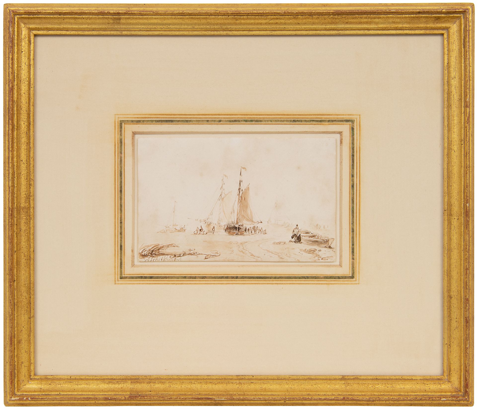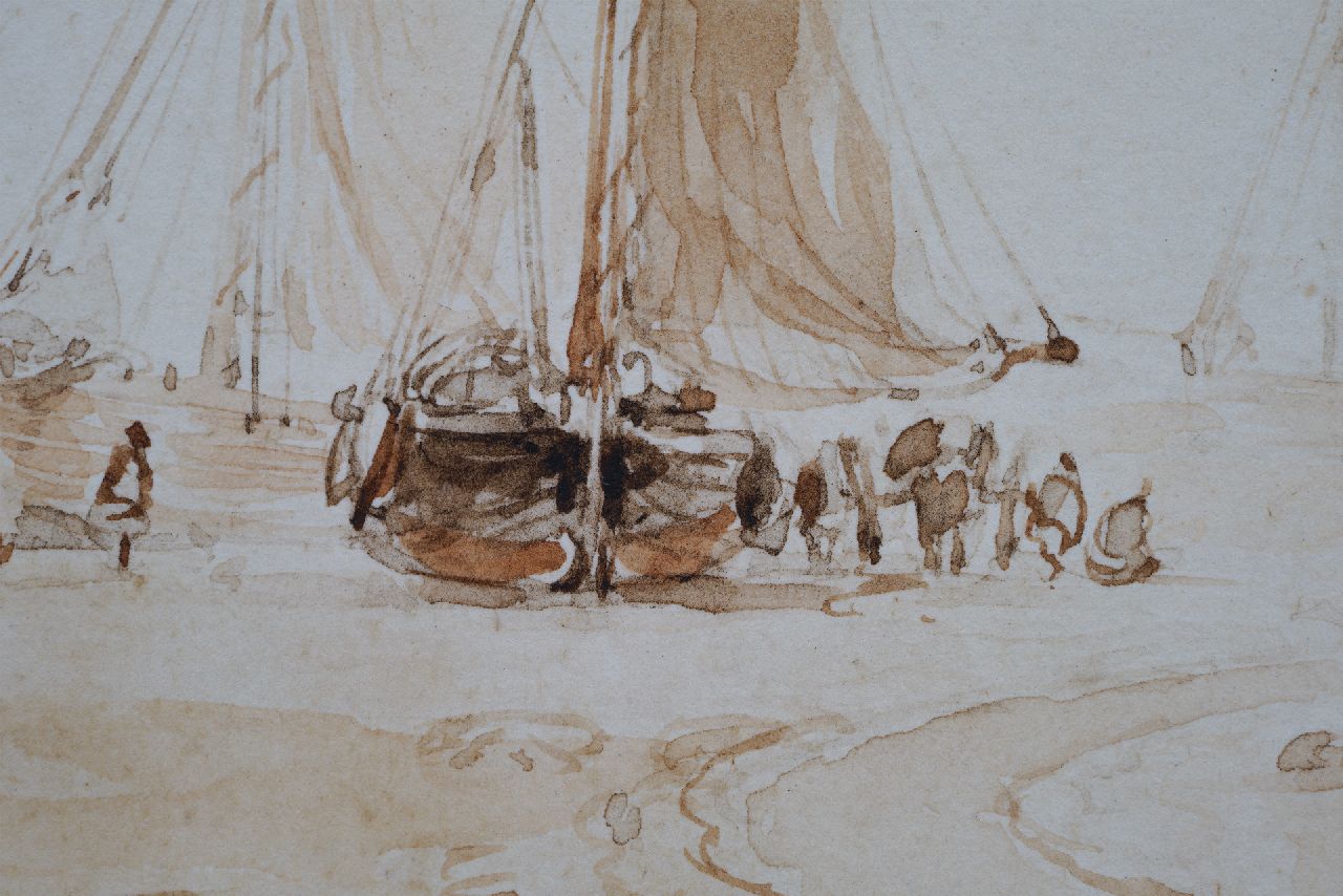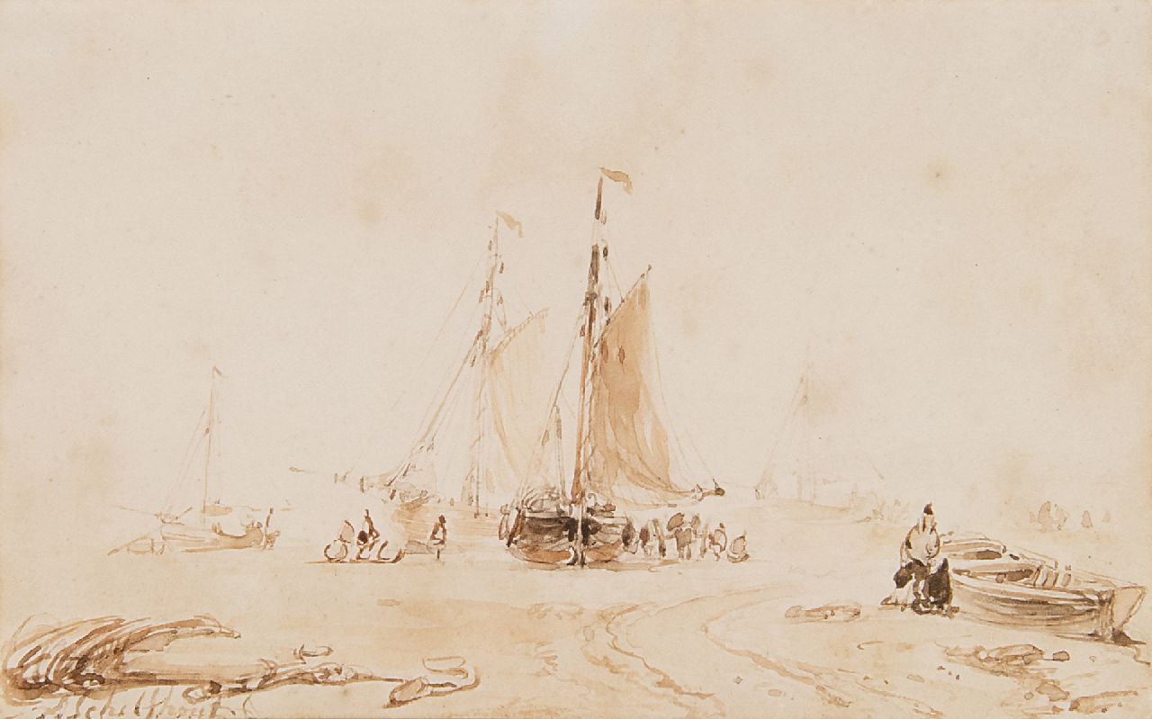 Andreas Schelfhout Kunstwerk • Aquarell • Zeichnung • zuvor zu verkaufen Fischer und Bomschiffe am Strand