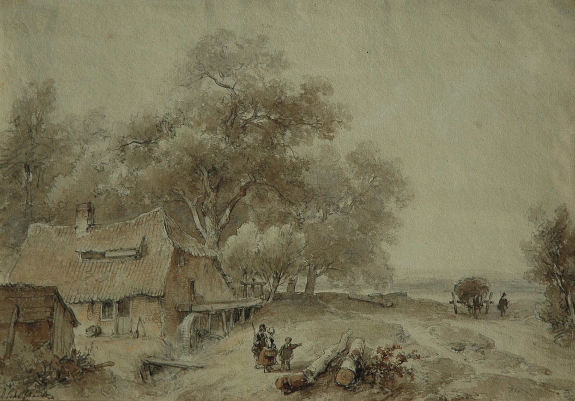 Andreas Schelfhout Kunstwerk • Aquarell • Zeichnung • zuvor zu verkaufen Landscape with figures near a watermill