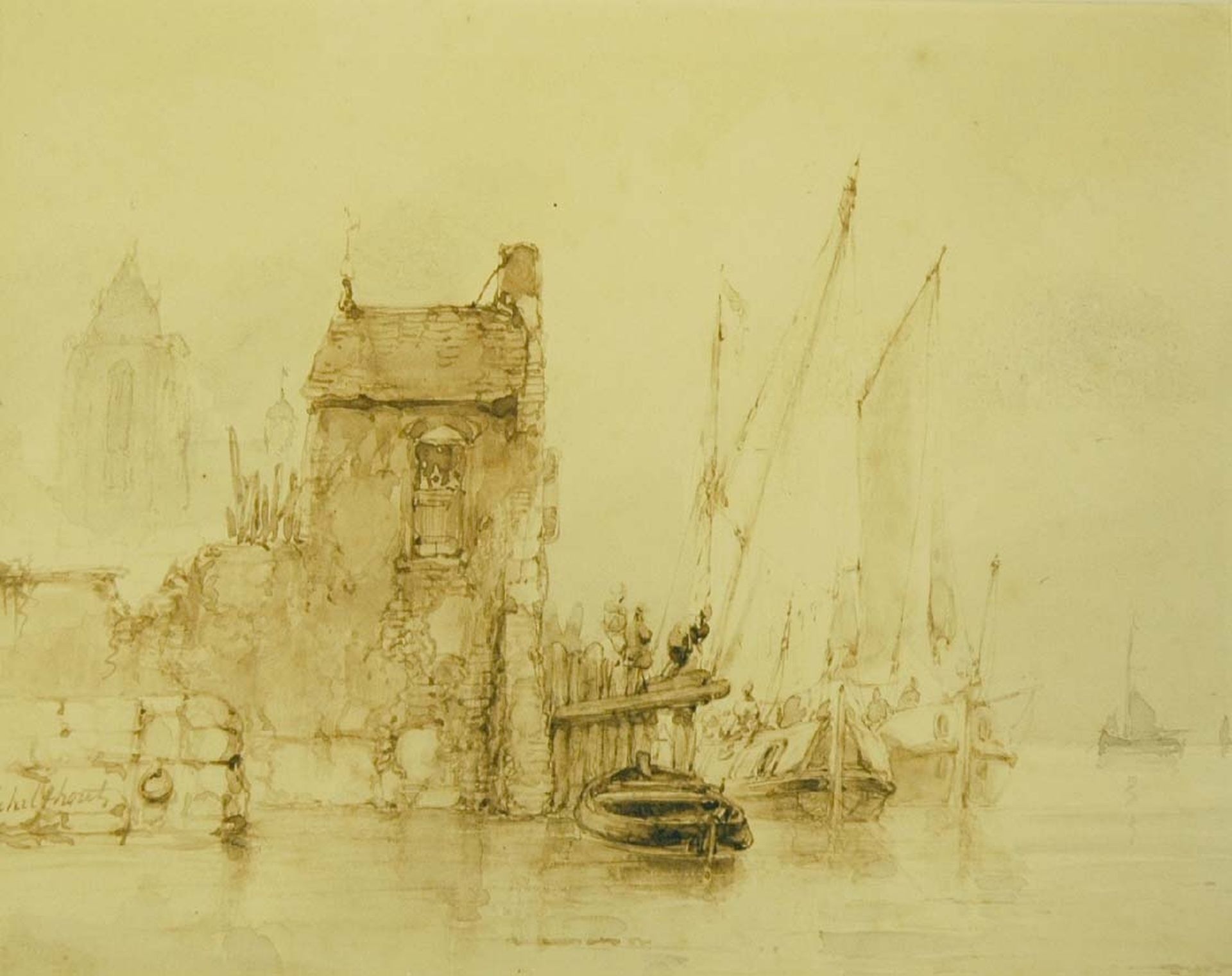 Andreas Schelfhout Kunstwerk • Aquarell • Zeichnung • zuvor zu verkaufen Moored shipping