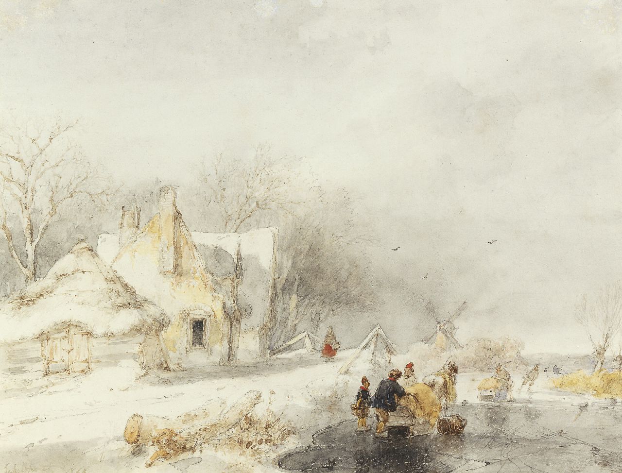 Andreas Schelfhout Kunstwerk • Aquarell • Zeichnung • zuvor zu verkaufen Skaters in a frozen winter landscape