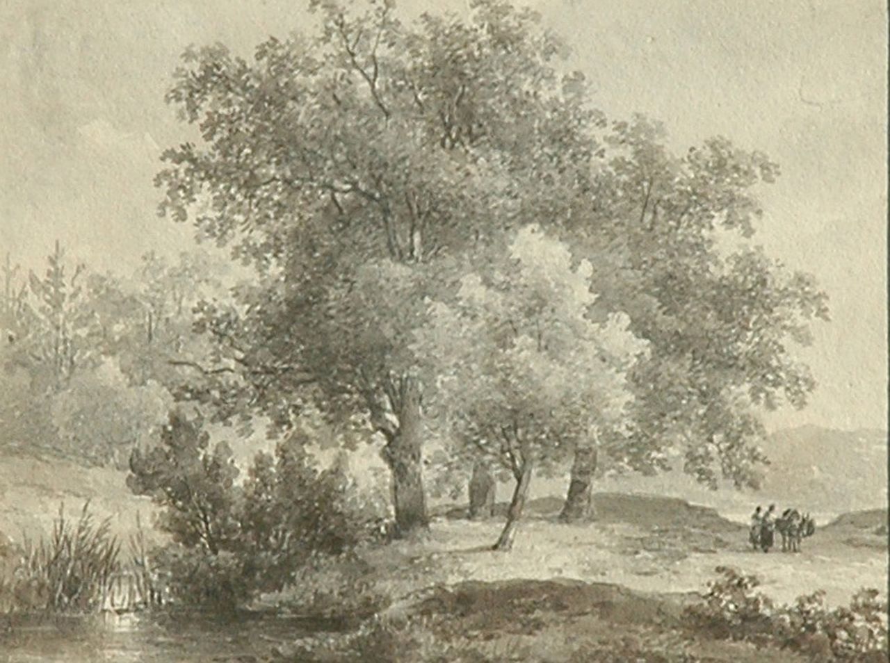 Andreas Schelfhout Kunstwerk • Aquarell • Zeichnung • zuvor zu verkaufen Travellers in a wooded landscape