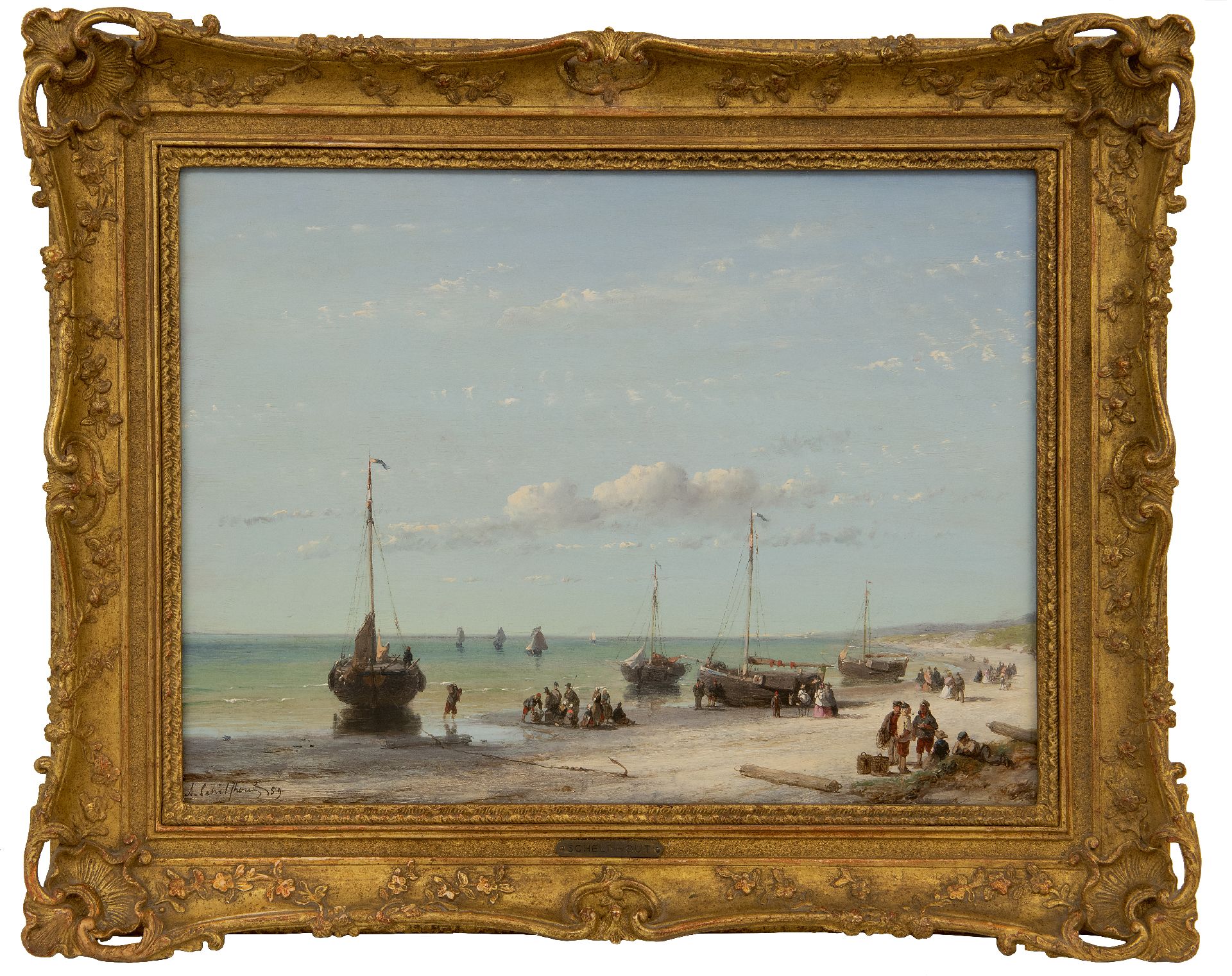 Andreas Schelfhout Kunstwerk • Gemälde • zu verkaufen Strandszene mit Schiffen, Fischern und eleganten Spaziergängern