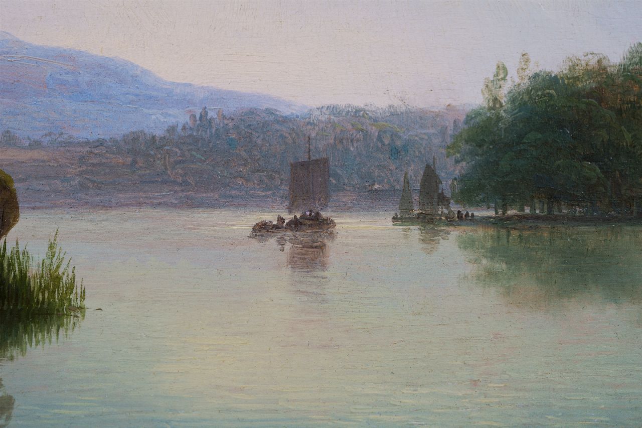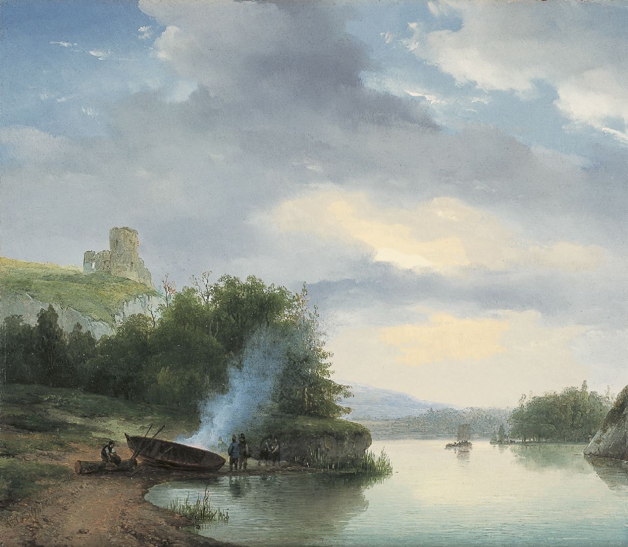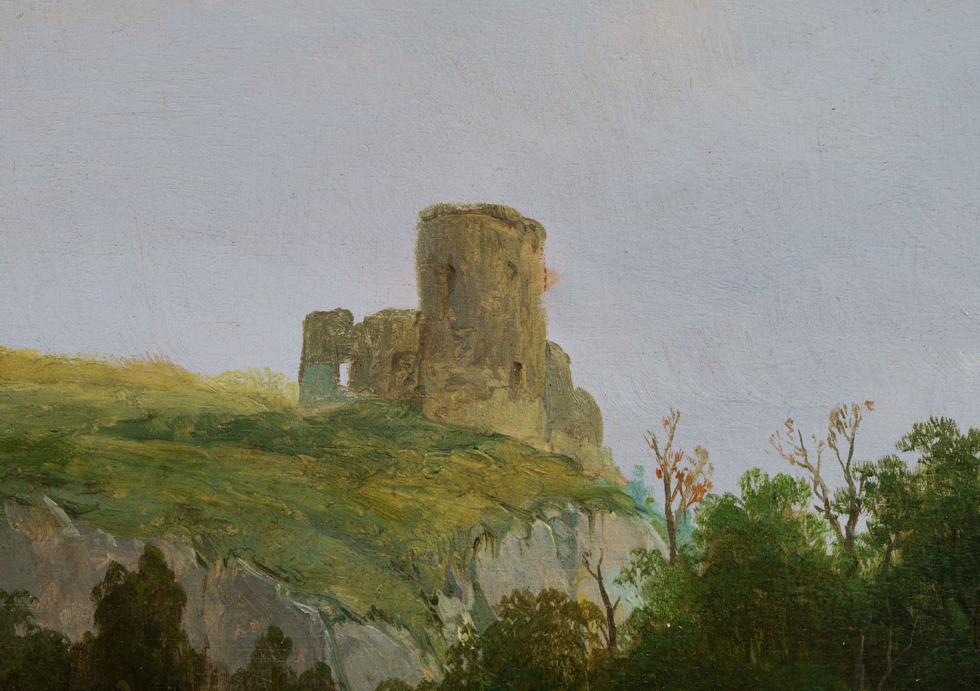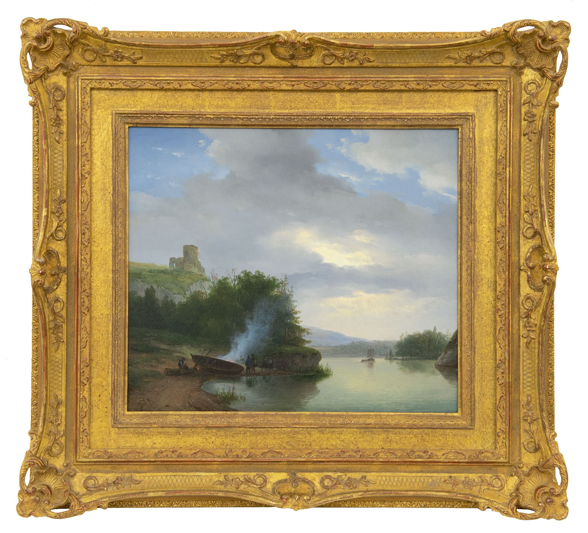 Andreas Schelfhout Kunstwerk • Gemälde • zuvor zu verkaufen Hügelicher Flusslandschaft mit Burgruine
