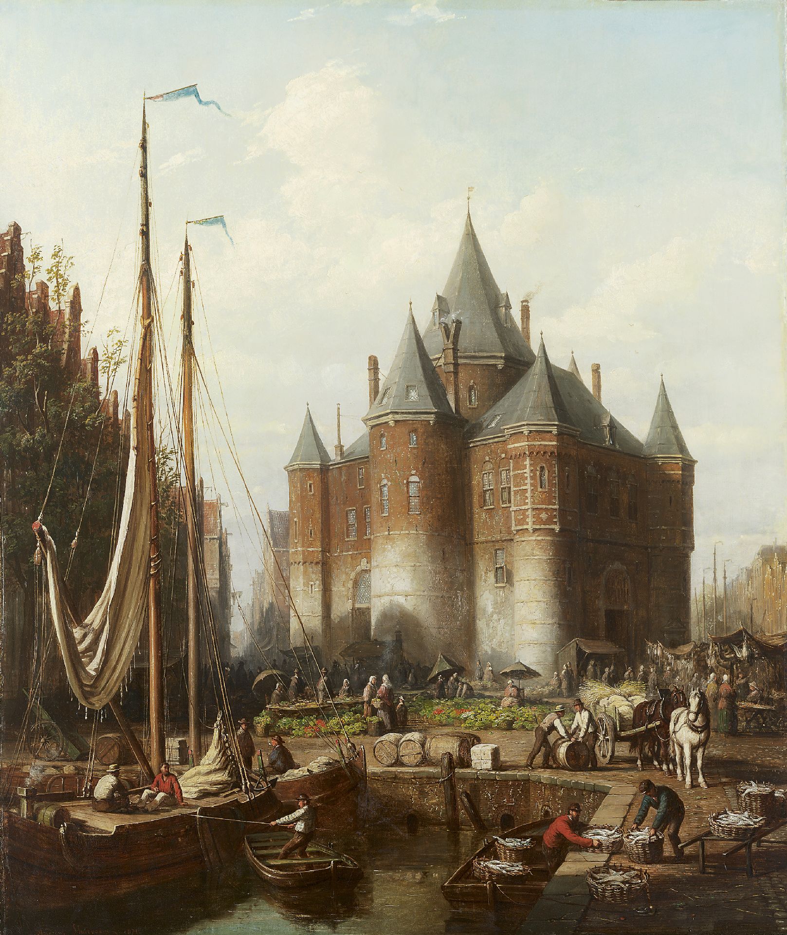 A busy dock scene and market at 'de Waag' Amsterdam