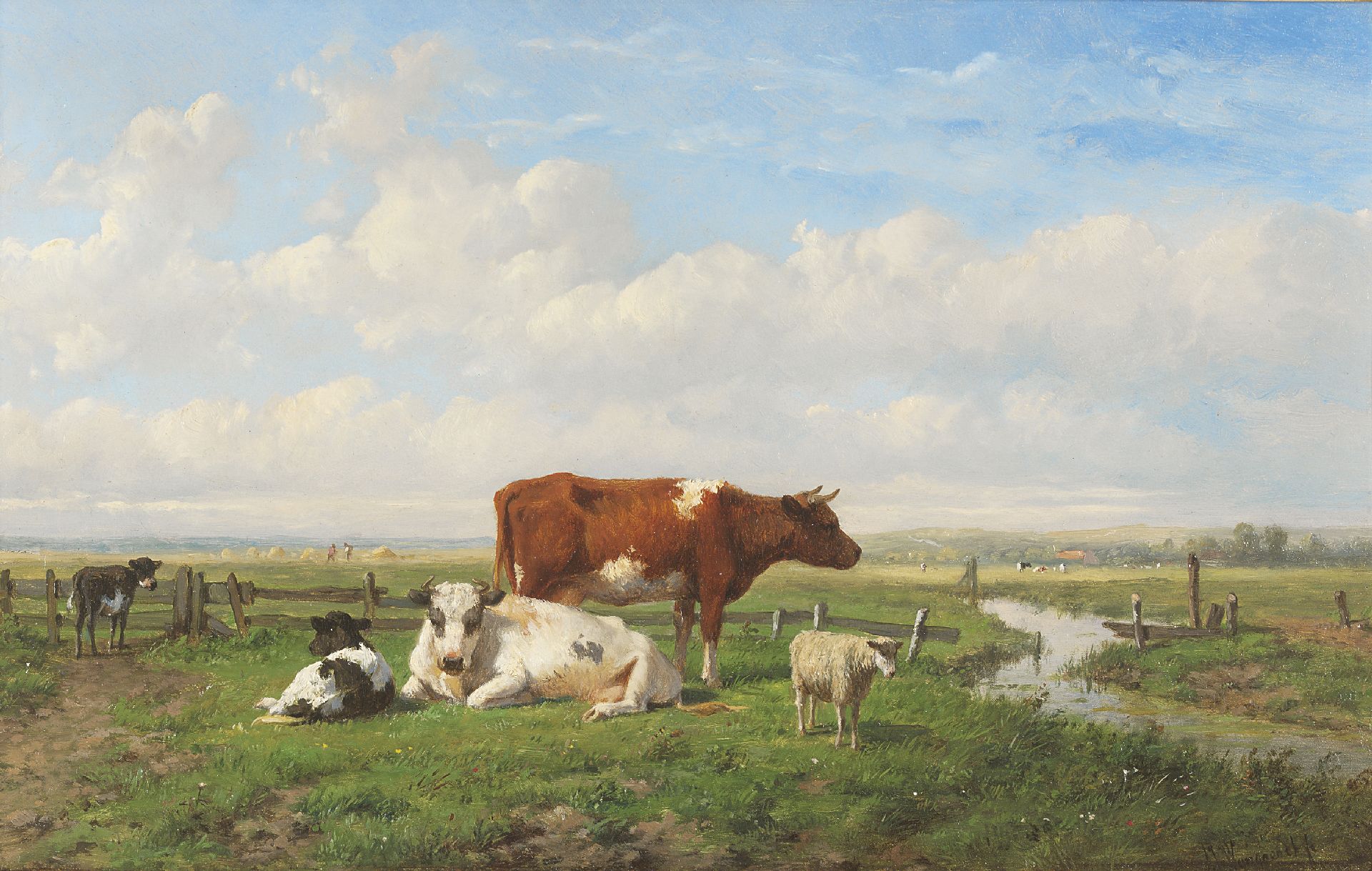 Anthonie Jacobus van Wijngaerdt Kunstwerk • Gemälde • zuvor zu verkaufen Holländische Weidelandschaft mit Vieh