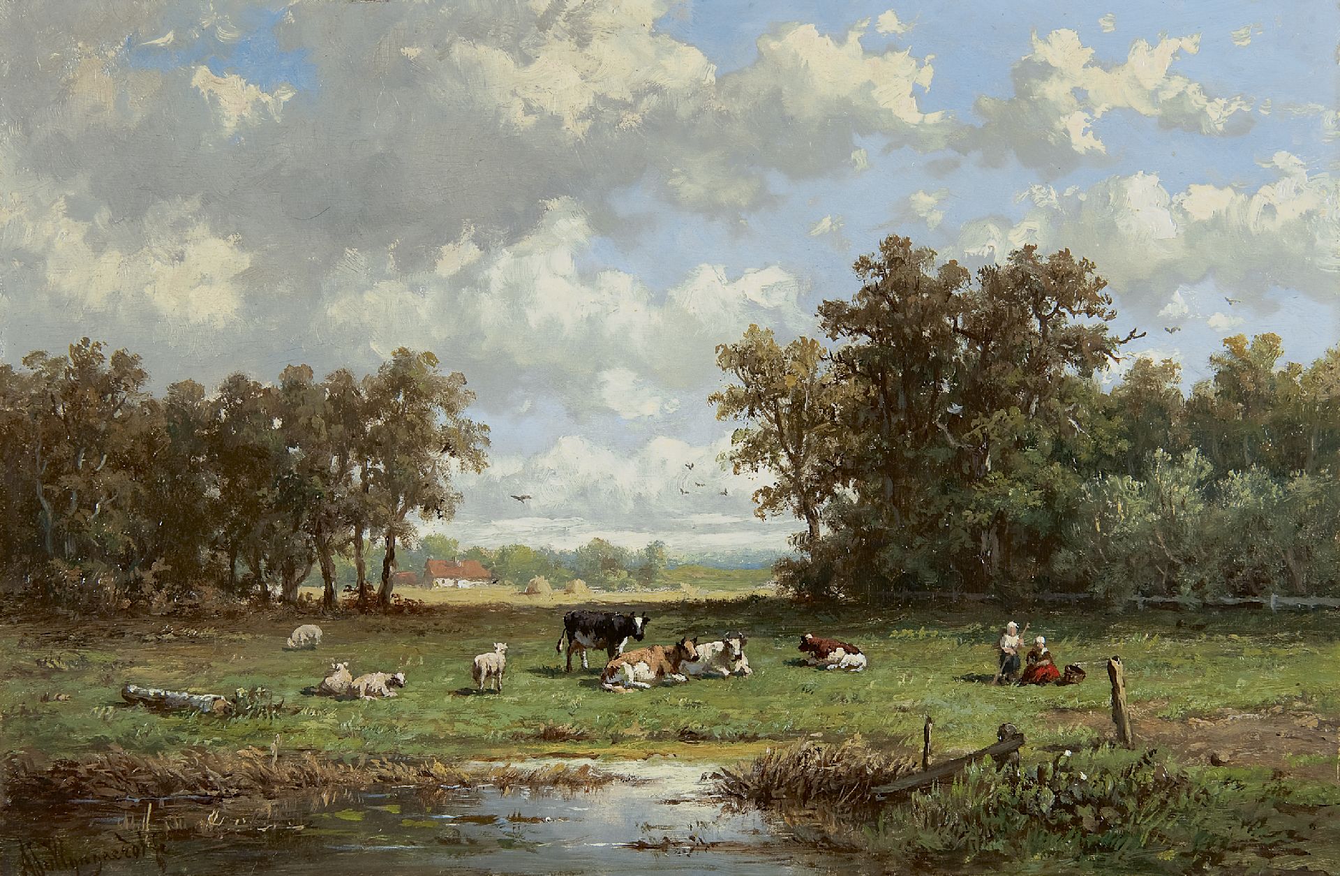 Anthonie Jacobus van Wijngaerdt Kunstwerk • Gemälde • zuvor zu verkaufen Landscape with cows and a shepherdess