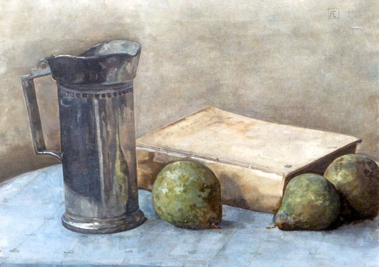 Antje Egter van Wissekerke Kunstwerk • Gemälde • zuvor zu verkaufen A still life with a tin jug, a boek and three pears