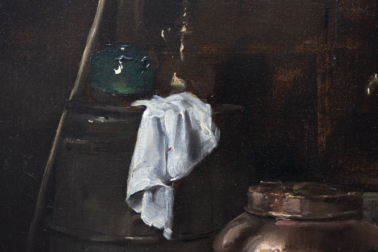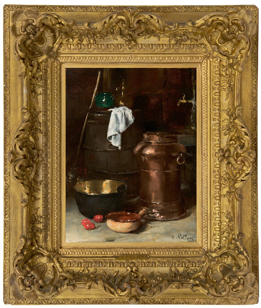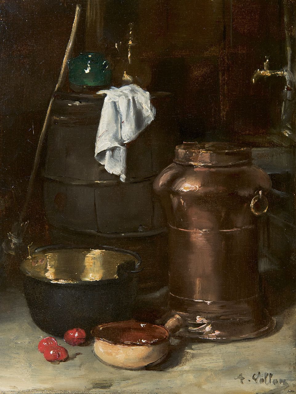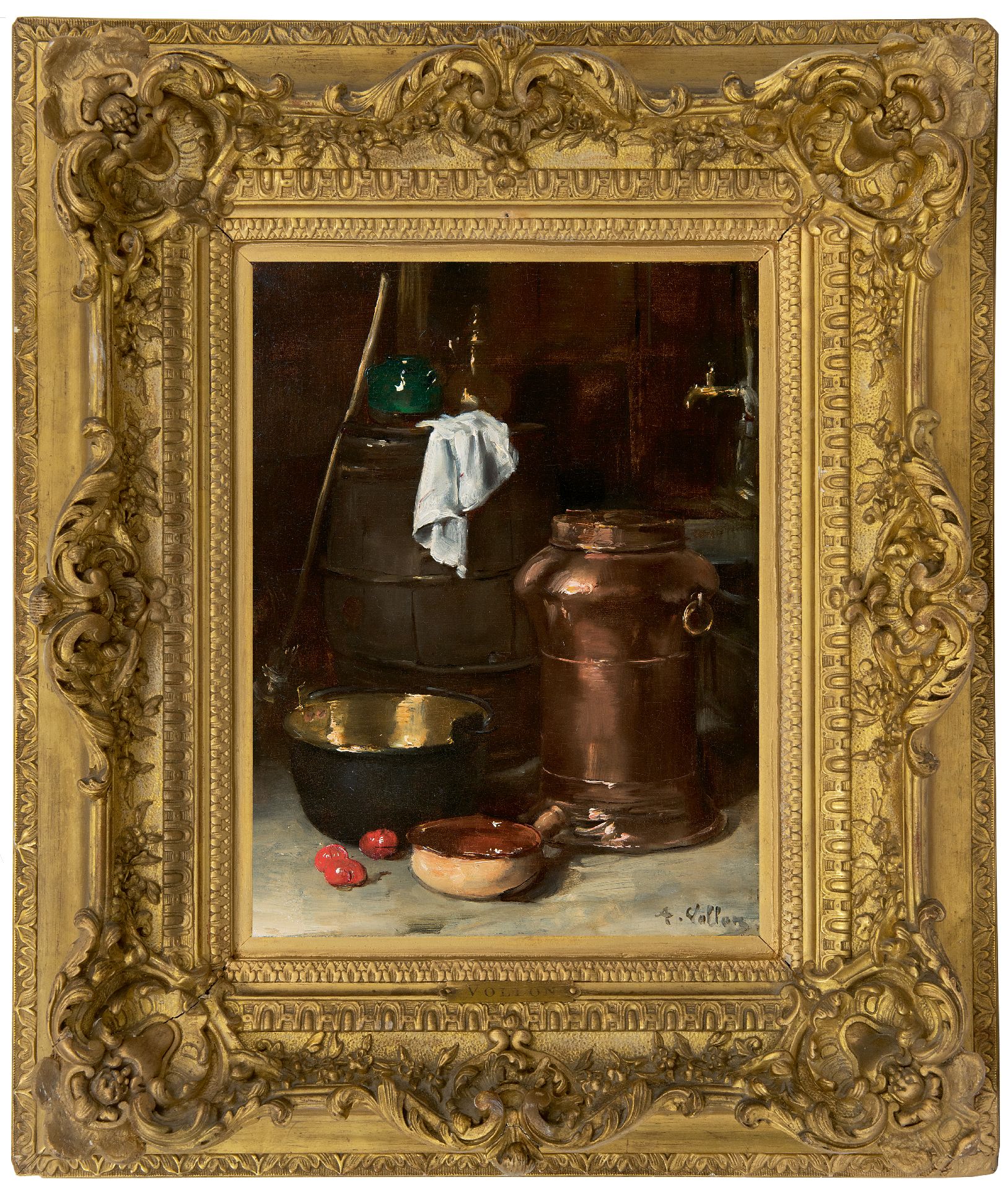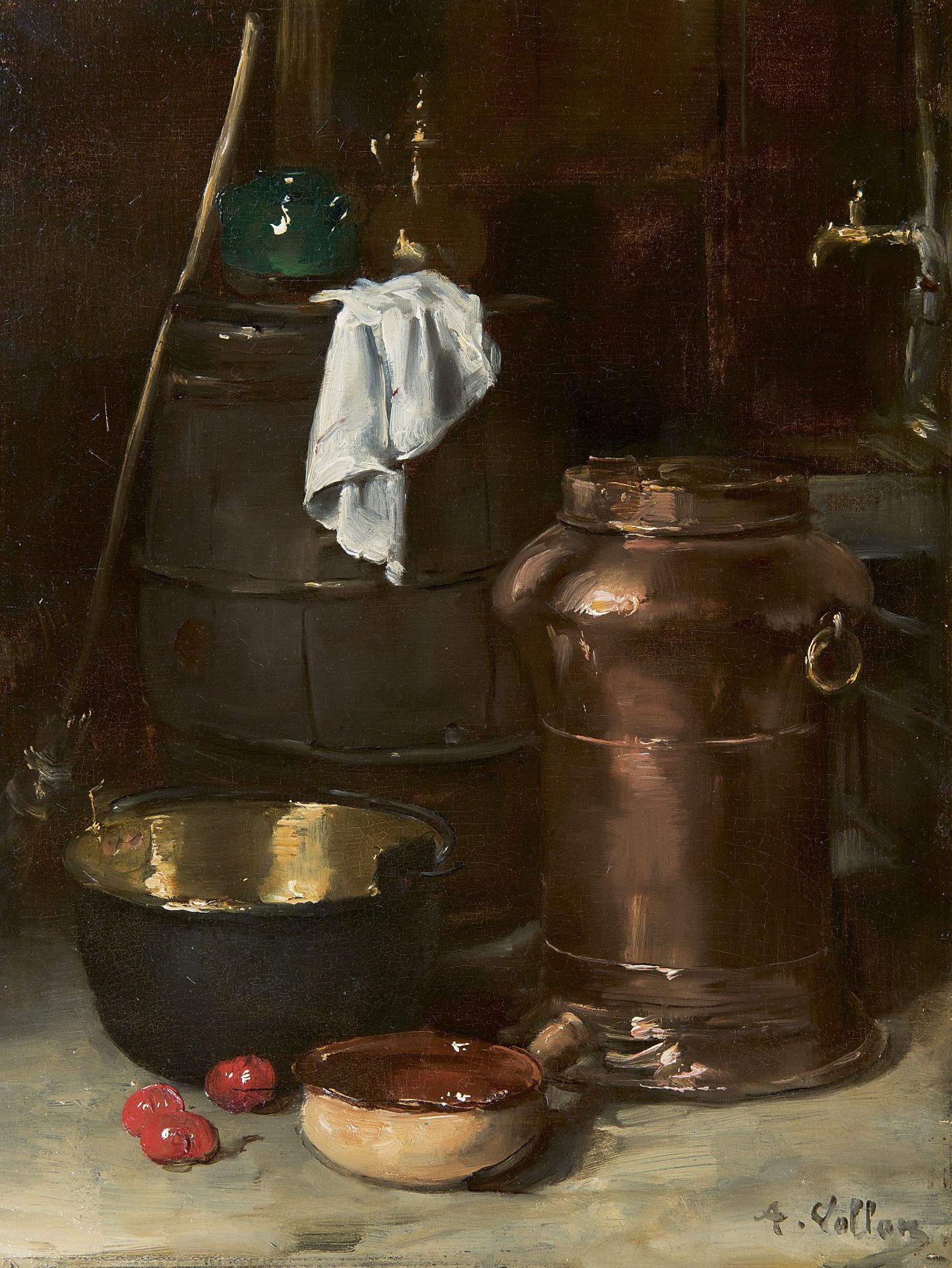 Antoine Vollon Kunstwerk • Gemälde • zu verkaufen Stillebenmit Kupferfass und Kochtopf